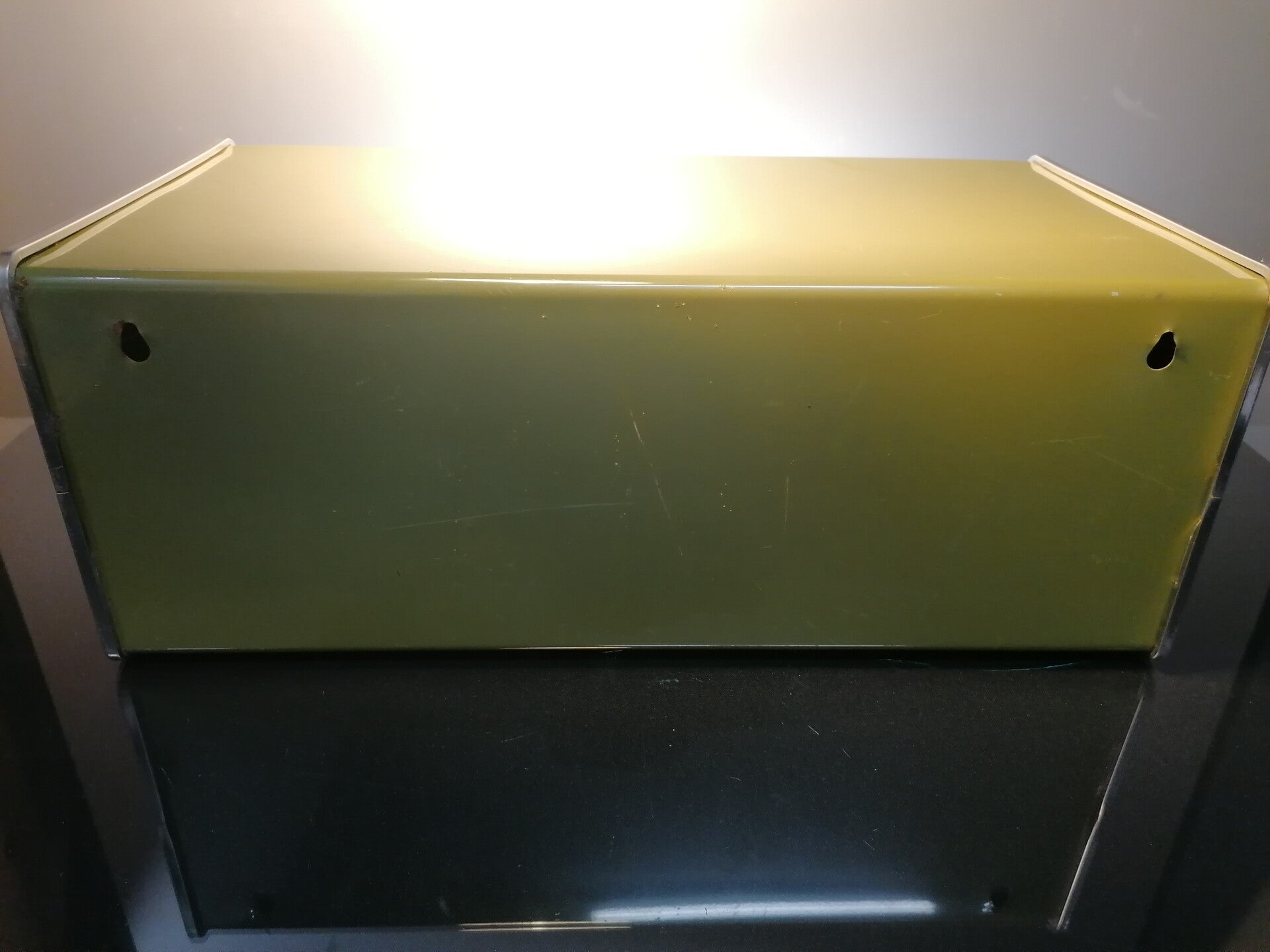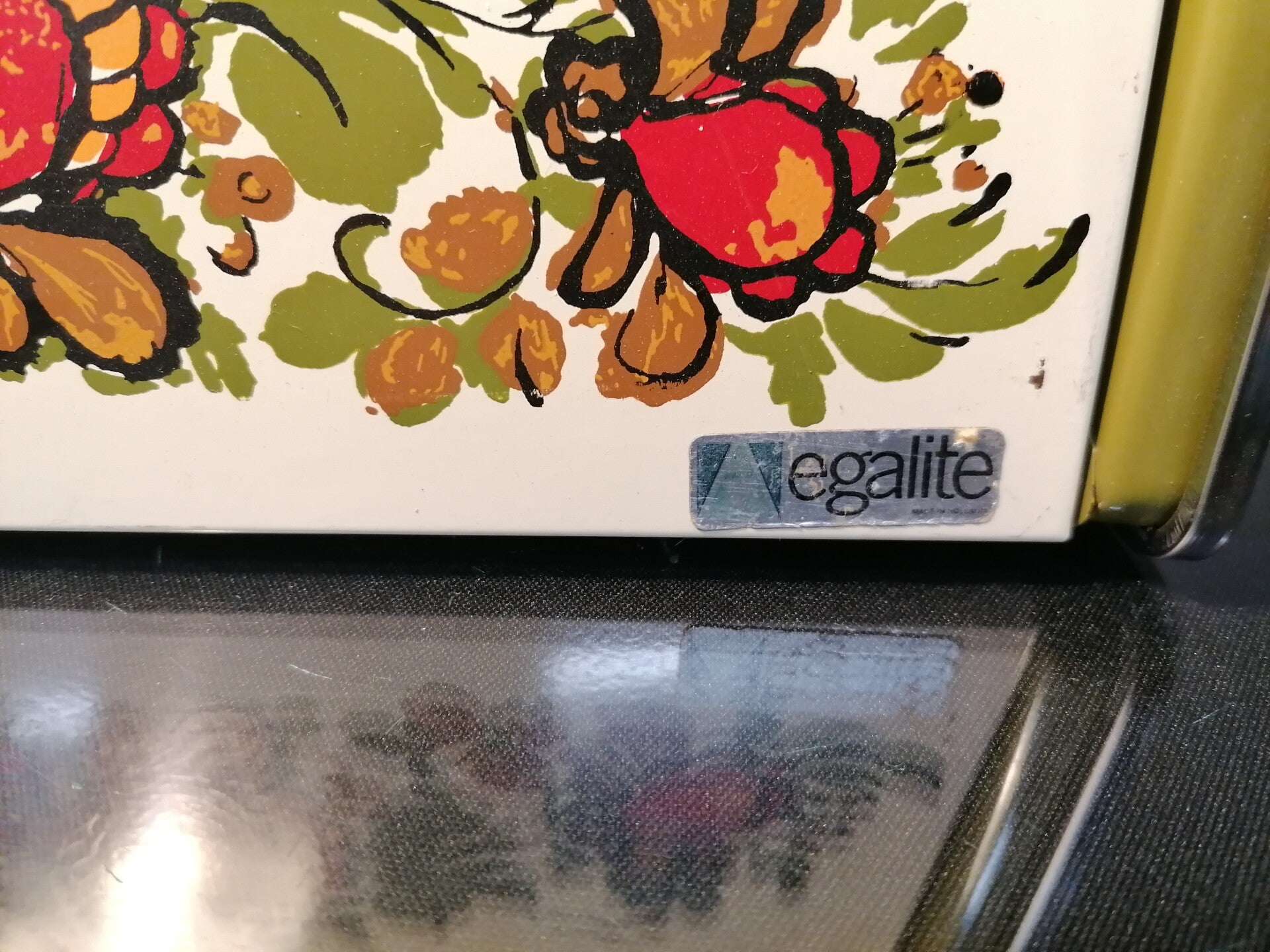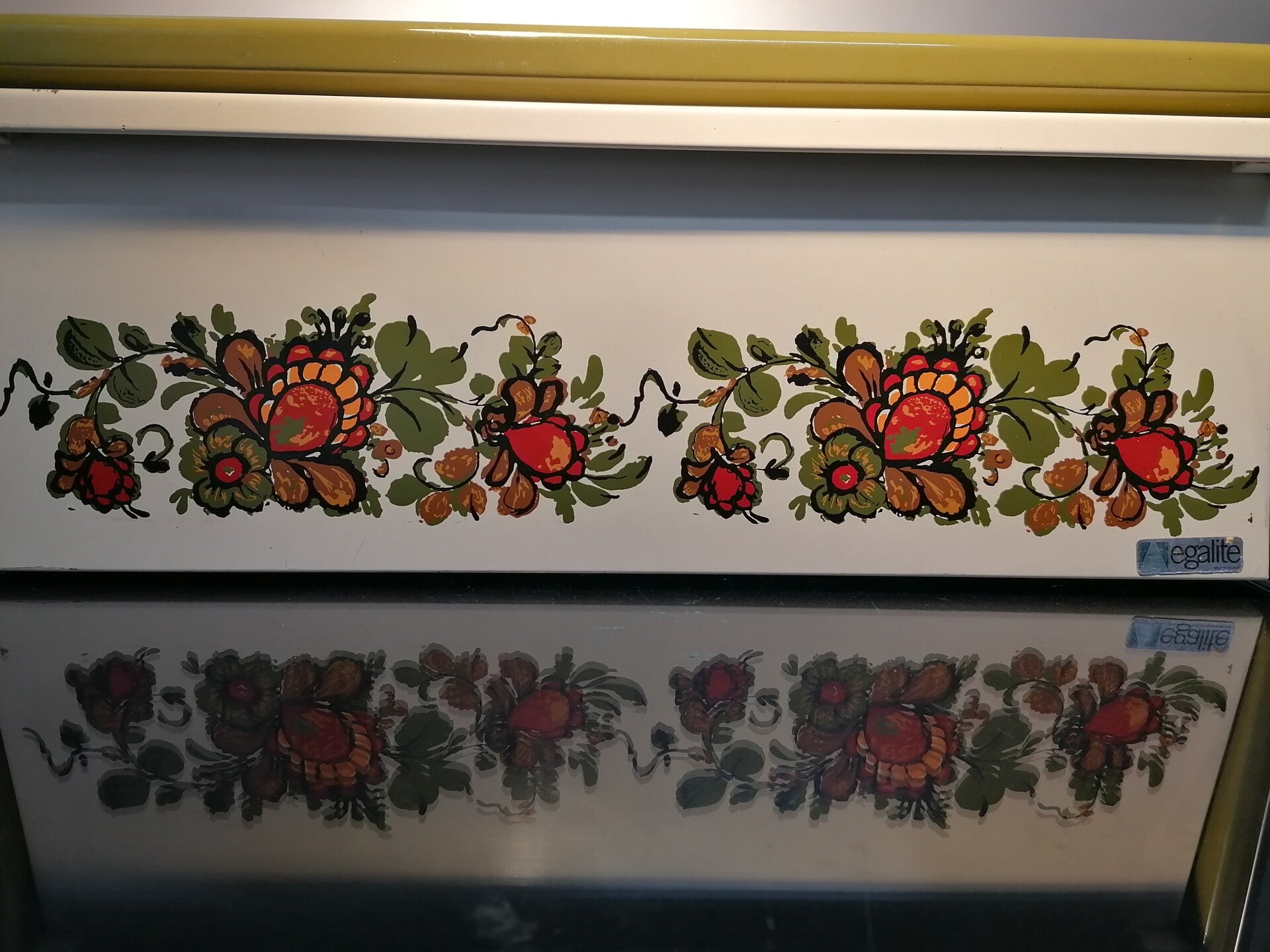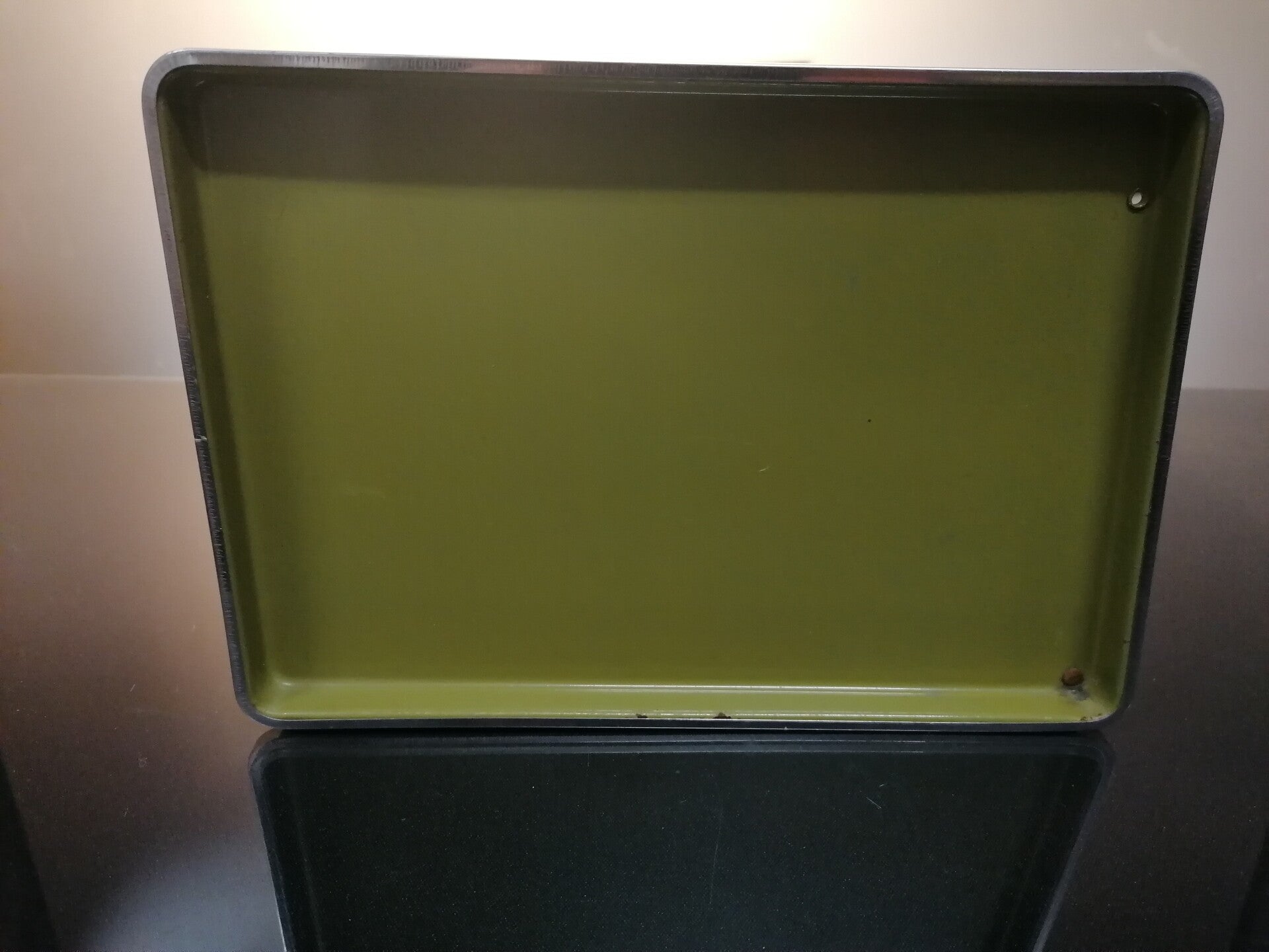 The lunch box is beautifully lacquered in the colors pastel, green and white.