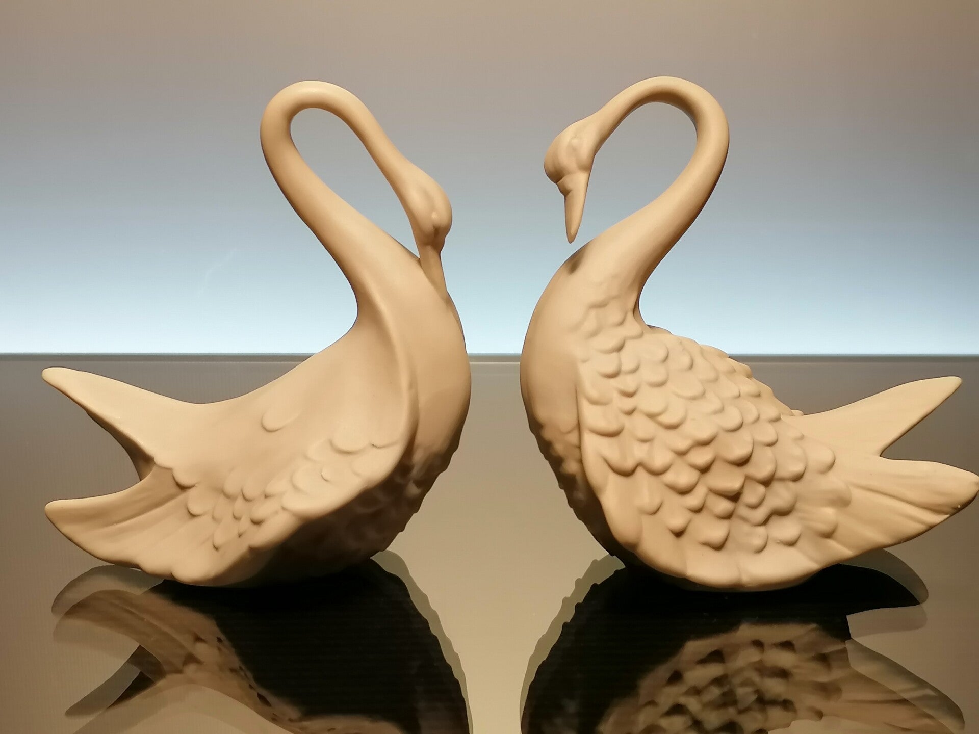 the swans are made of bicuit porcelain, by the famous porcelain manufactory “Capodimonte” in Italy.