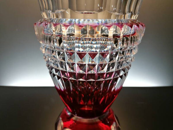 This vase is mouth blown from clear crystal, after which a layer of red crystal is applied over it. During the finish, part of the red crystal is then cut away so that beautiful geometric figures appear. These, in turn, give a beautiful sparkle in the light.