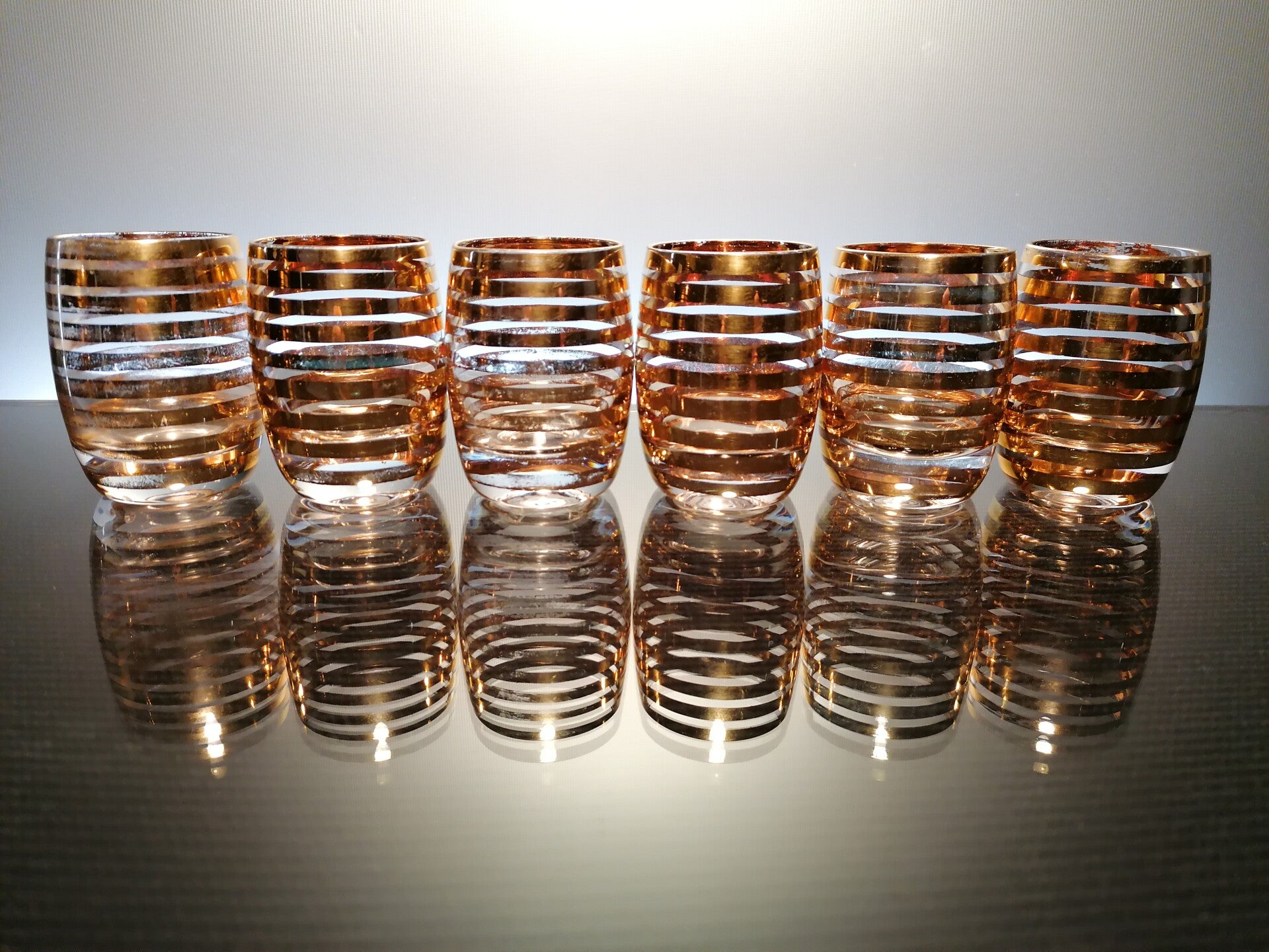 After blowing the objects, vertical golden lines were painted around them by hand.