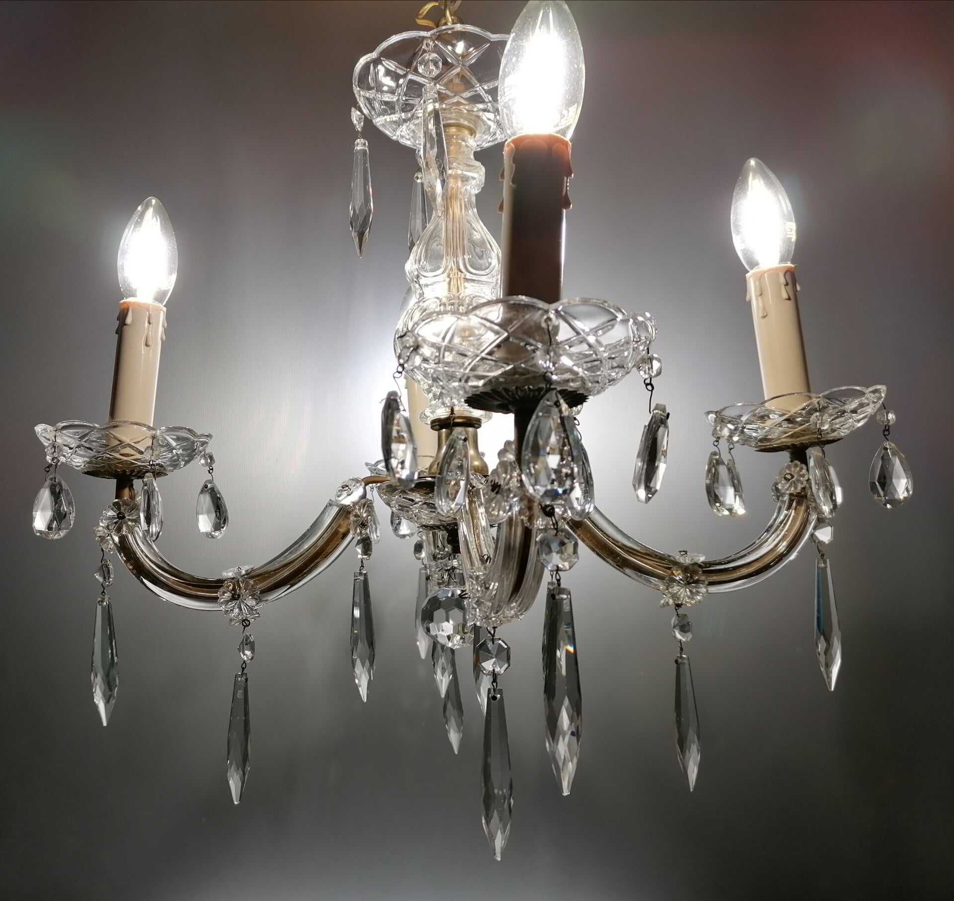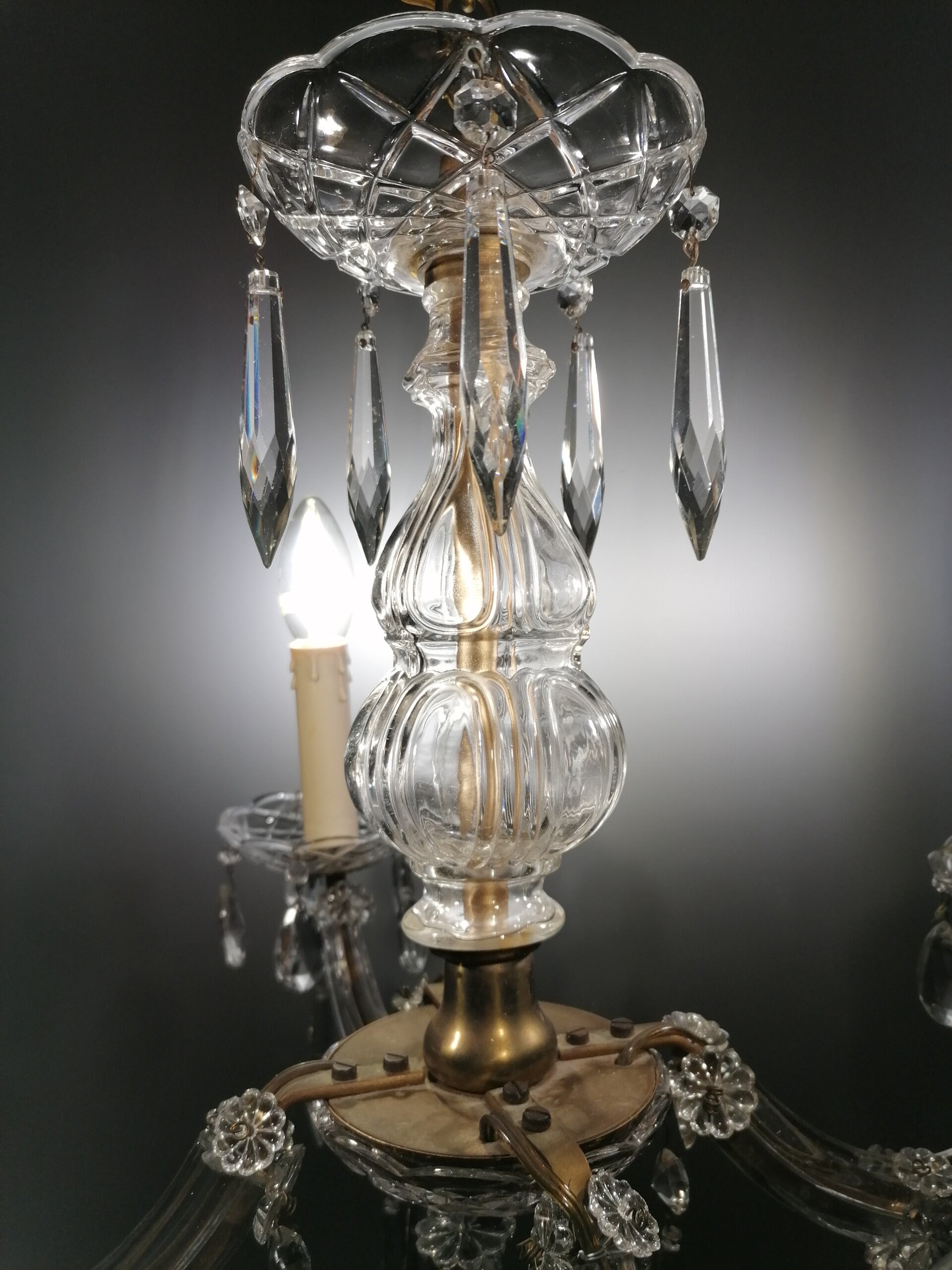 Numerous crystal ornaments dangle under the metal curved arms. The arms are also set with crystal plates.