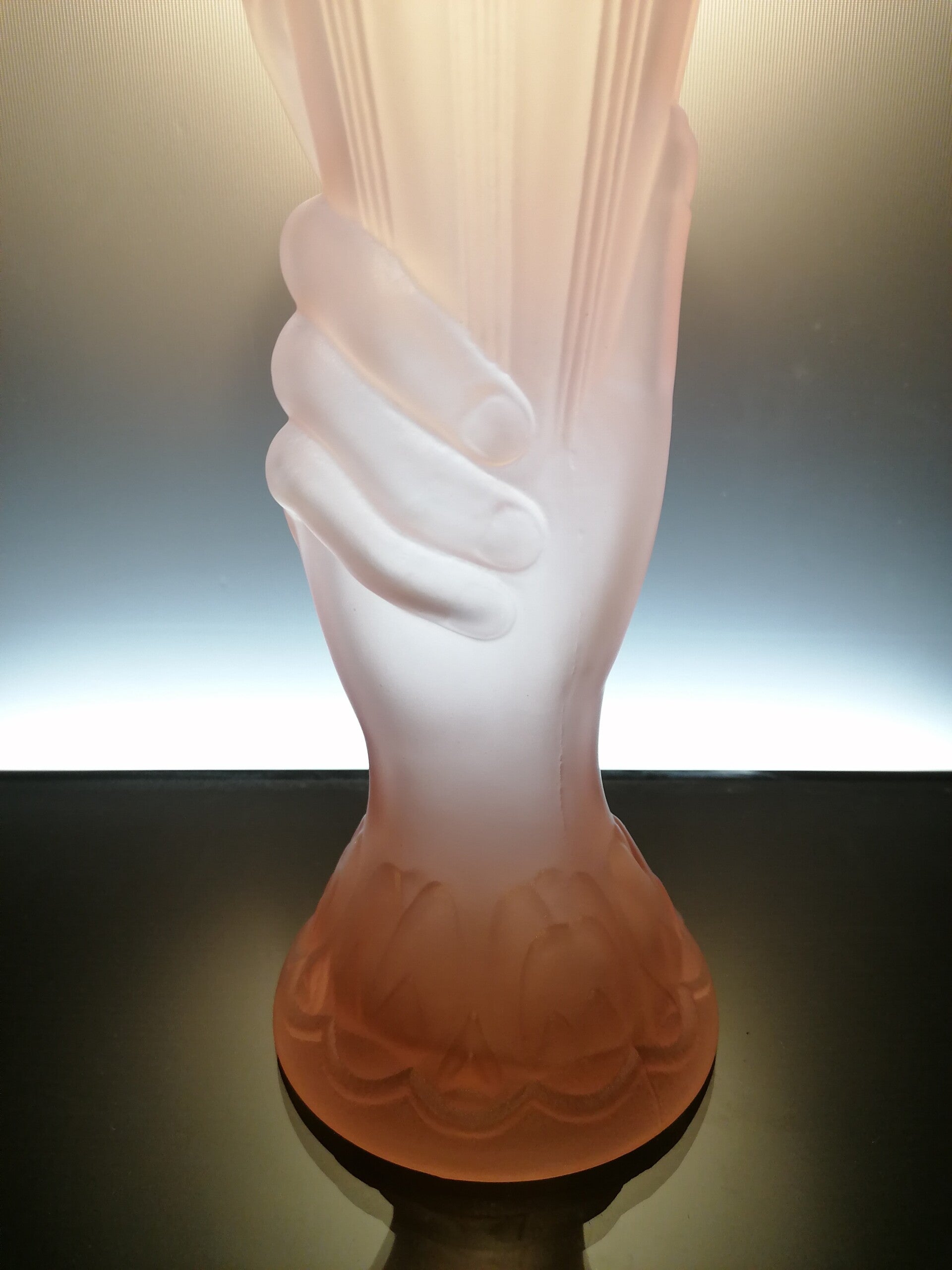 Very beautiful glass vase in the shape of a hand holding a horn.