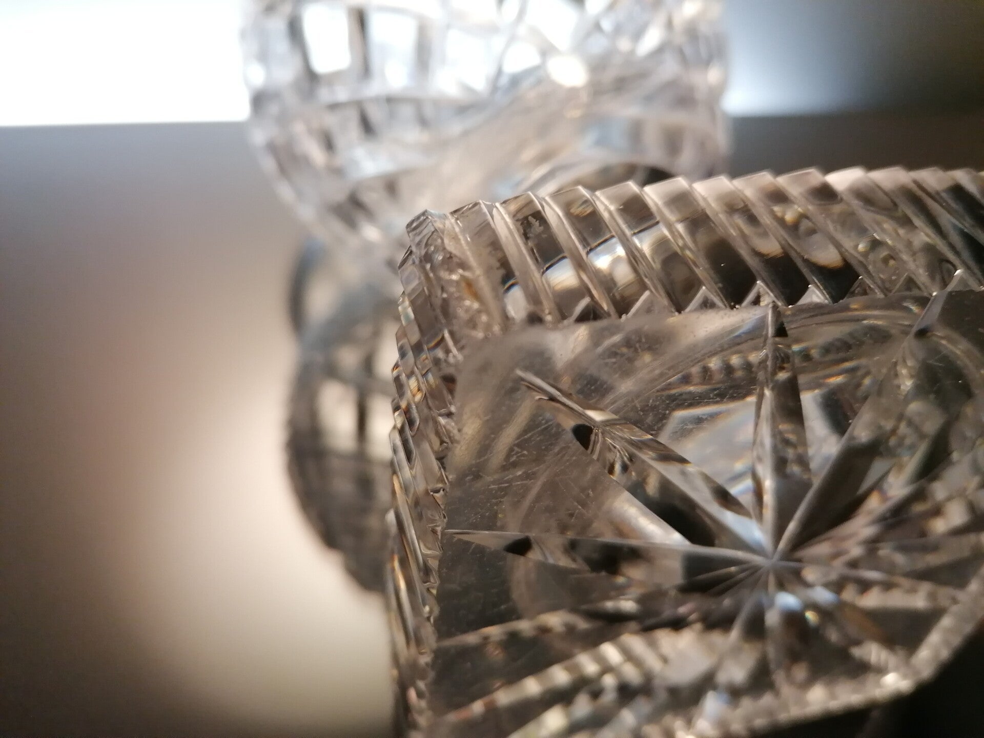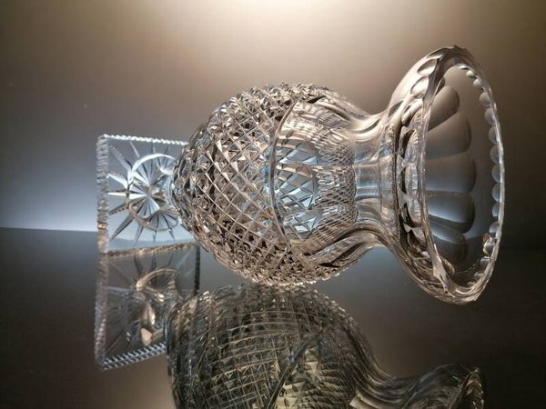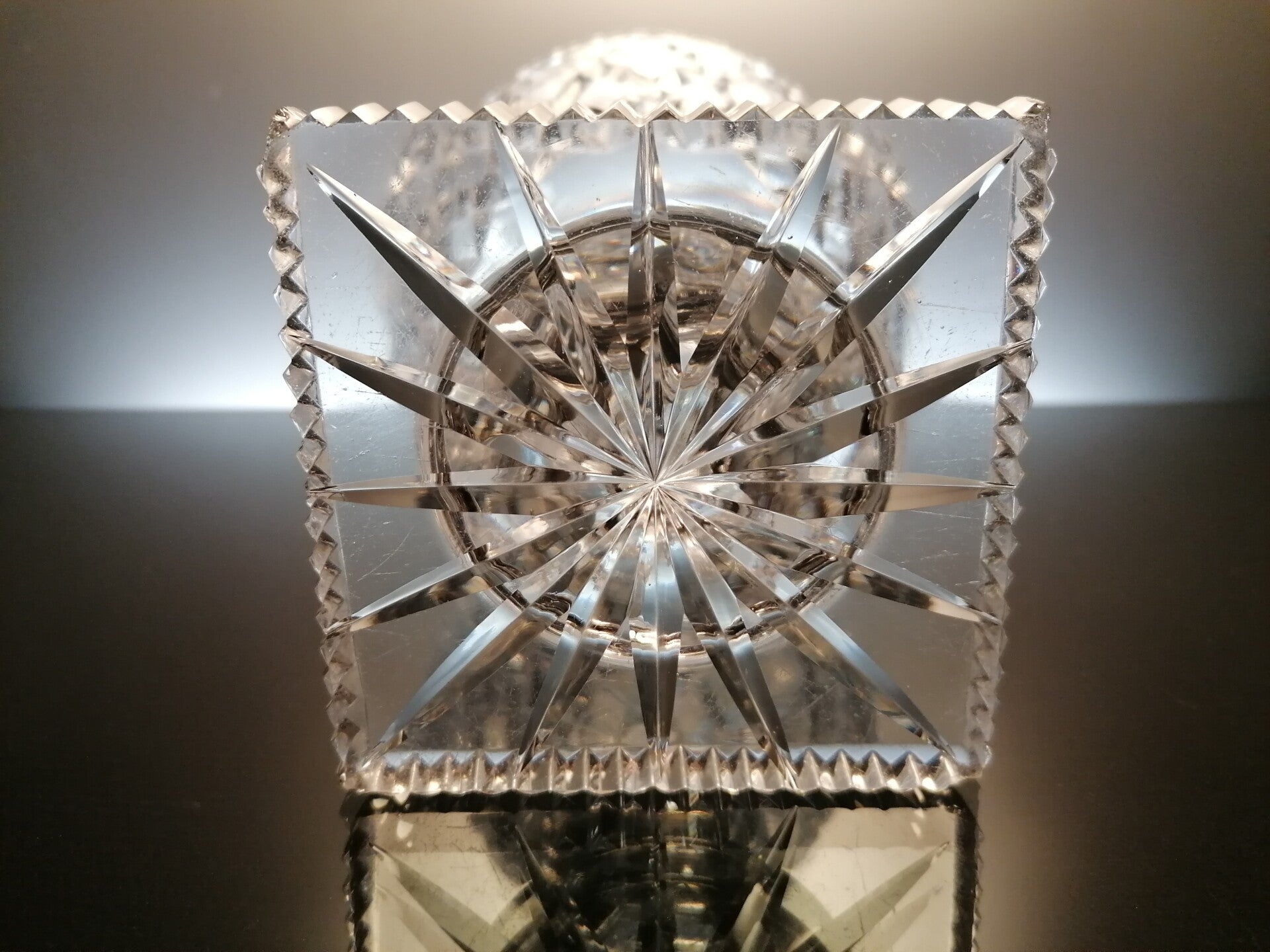 The vase is mounted on a square base that is also cut. At the top, the vase has a serrated edge. This model of vases is called "Medicis"