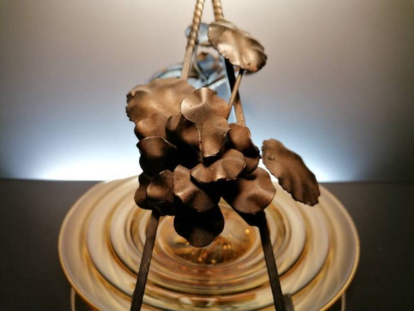 The glass bowl is mounted in a metal ironwork consisting of roses and leaves.