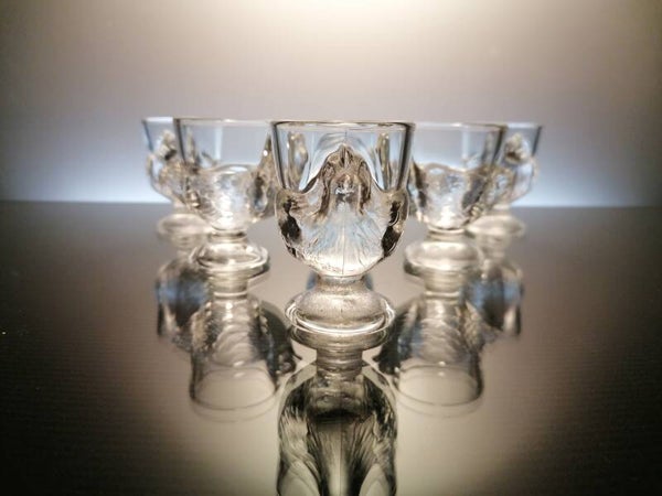 6 beautiful egg cups, made in the first half of the 20th century to the middle of the 20th century, by a French glass manufacturer.