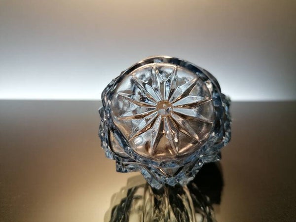 It is made of cast and pressed blue glass, with a crystal content to achieve a more beautiful shine.