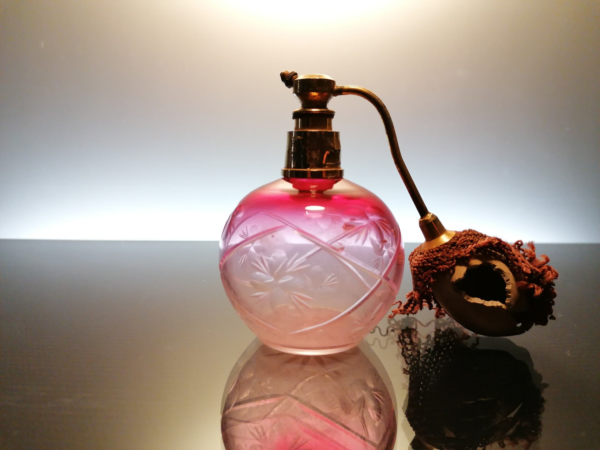This pink perfume bottle was made in the late 19th - early 20th century in Europe.