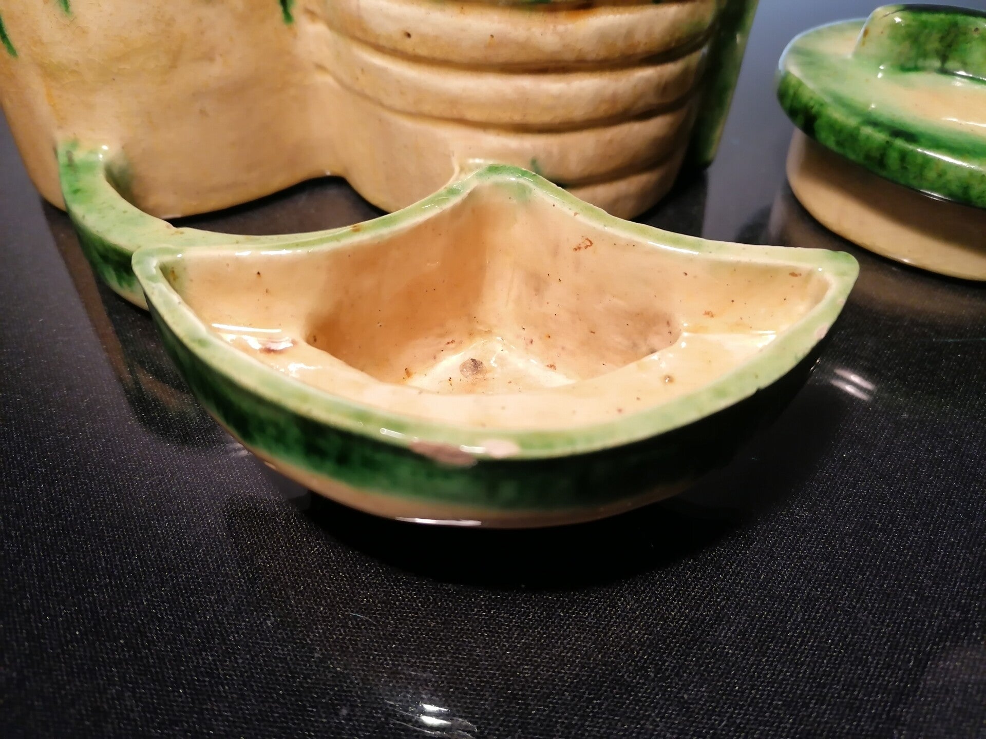 The tobacco set is made of several parts, such as a jar for tobacco, a holder for the pipe or cigars and a small ashtray at the front.