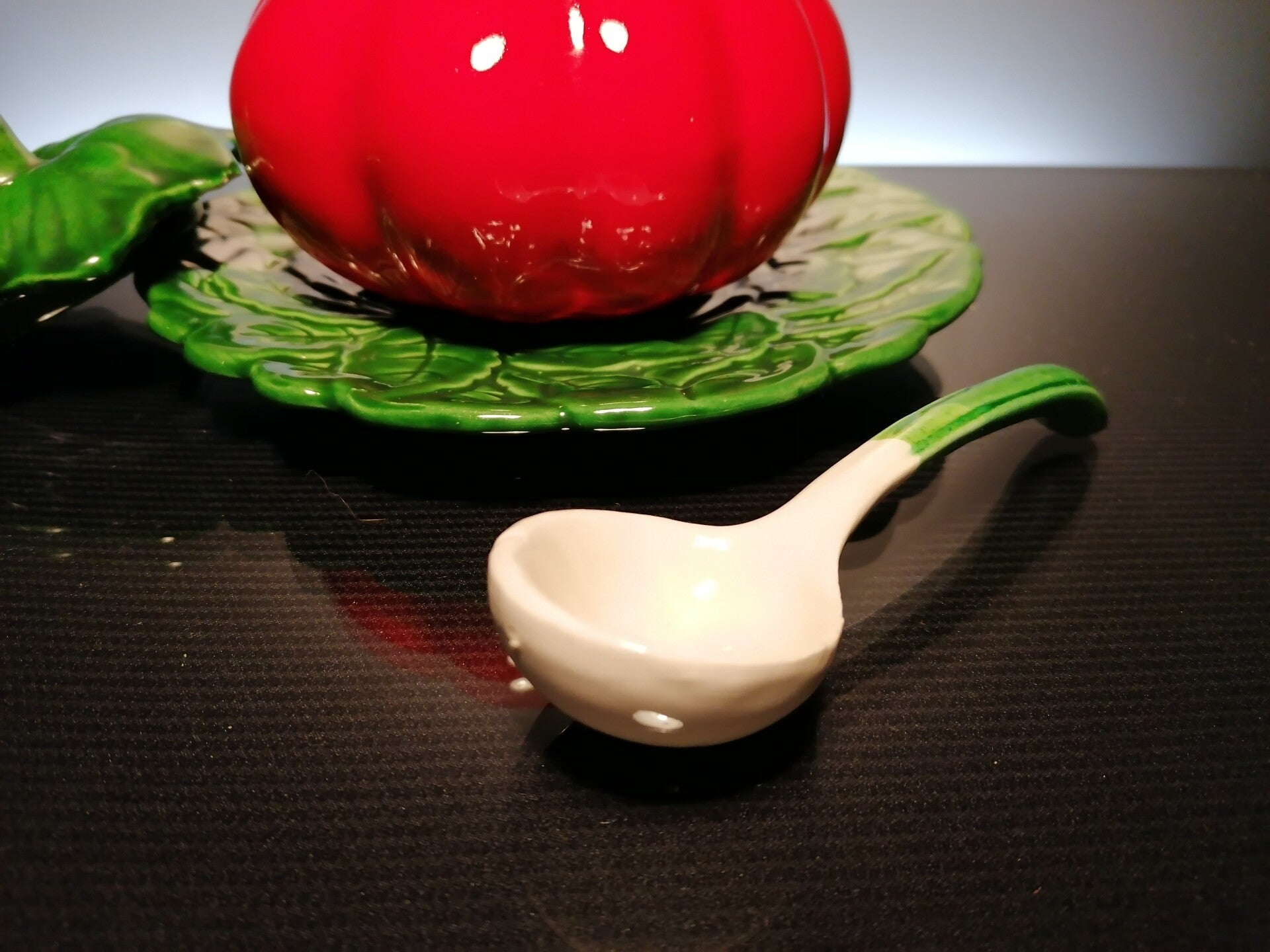 Very nice bowl with matching spoon, made in the shape of a pumpkin.