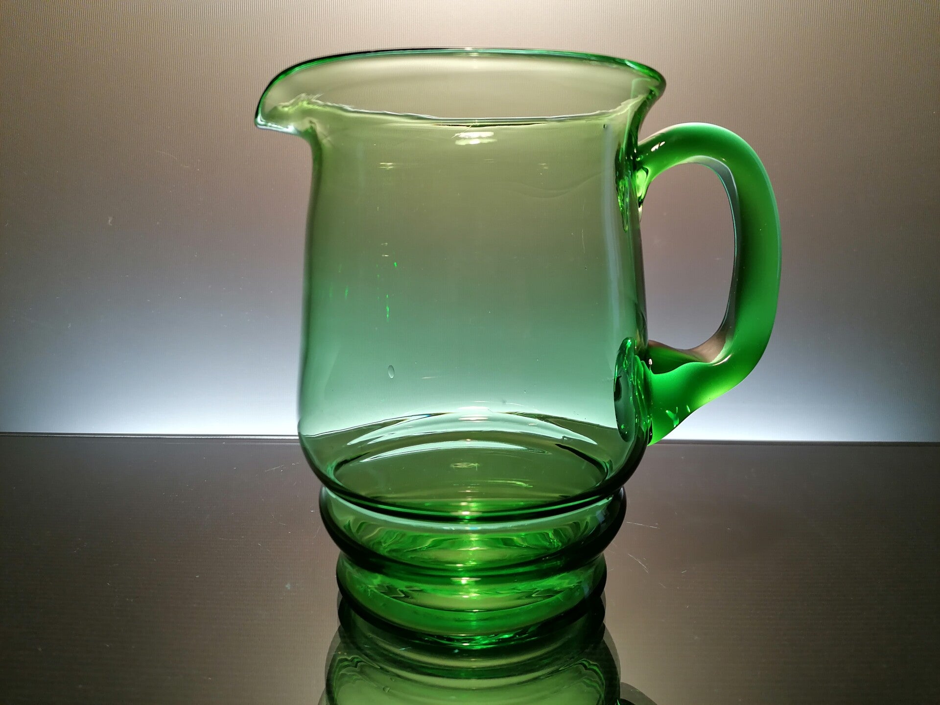 The jug is made of mouth-blown green glass and has a very sleek and simple shape which perfectly reflects the art deco period.