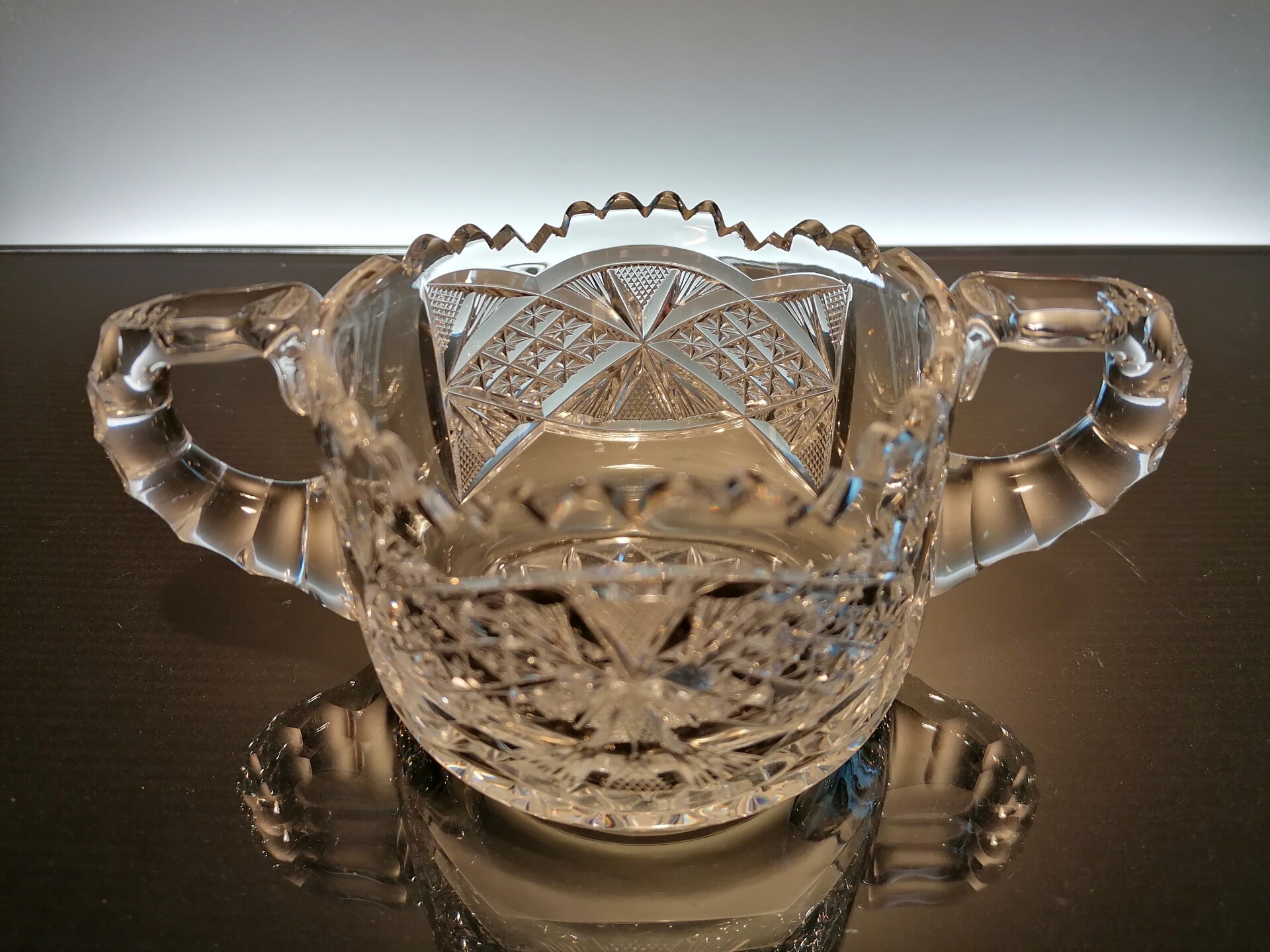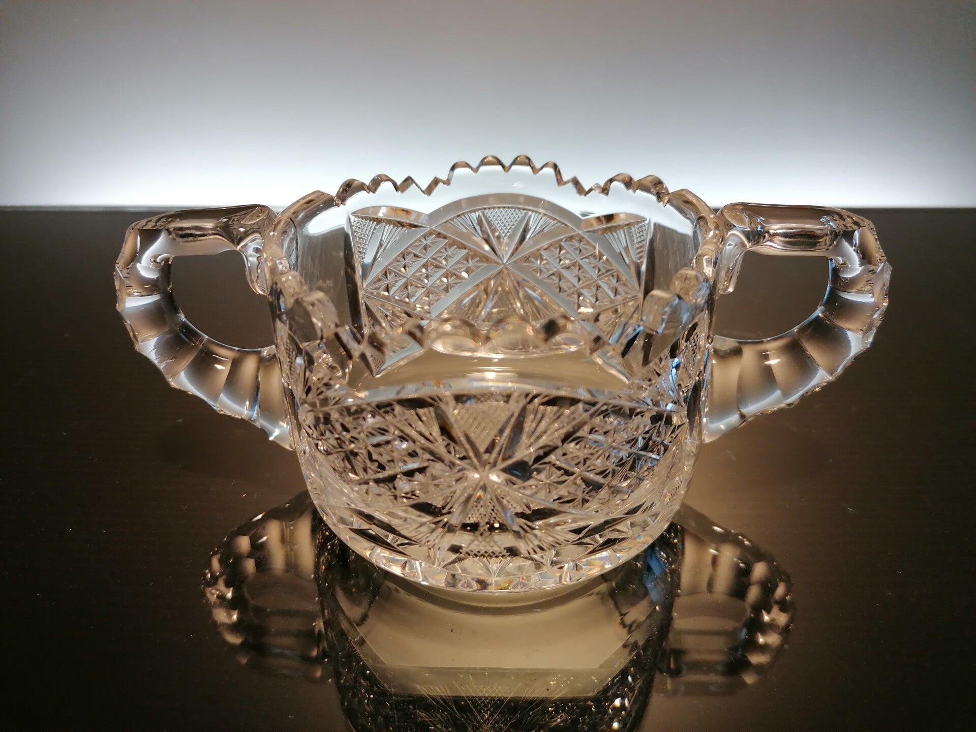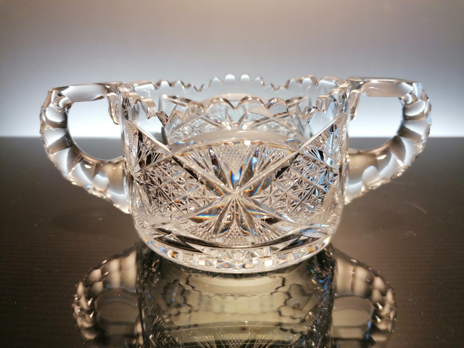 This rare bowl with handles is mouth blown from clear crystal. During the finish, part of the crystal is then cut away so that beautiful geometric figures appear. These, in turn, give a beautiful sparkle in the light.