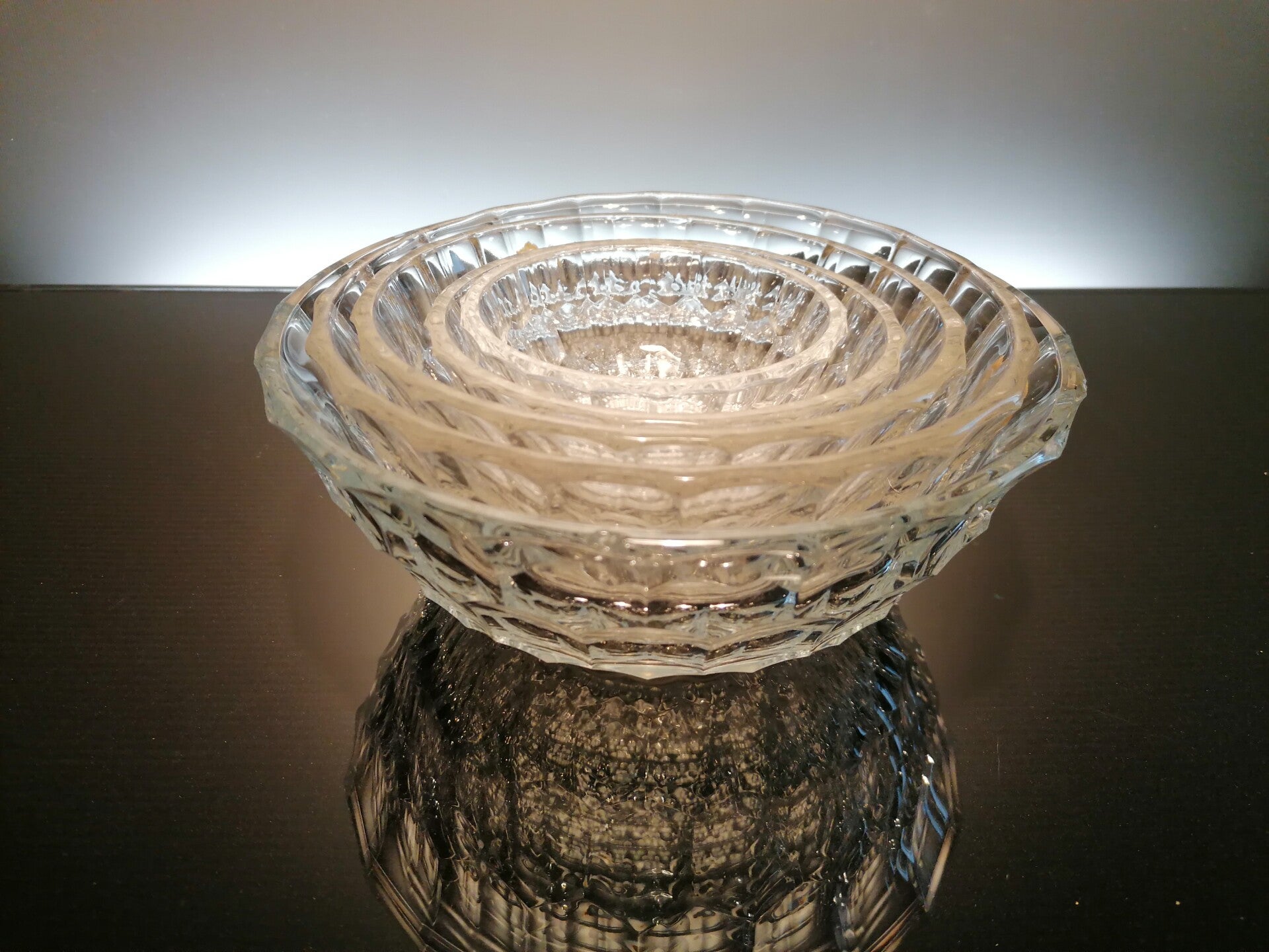 The set of 5 serving bowls is from large to small, so they fit nicely together for storage.