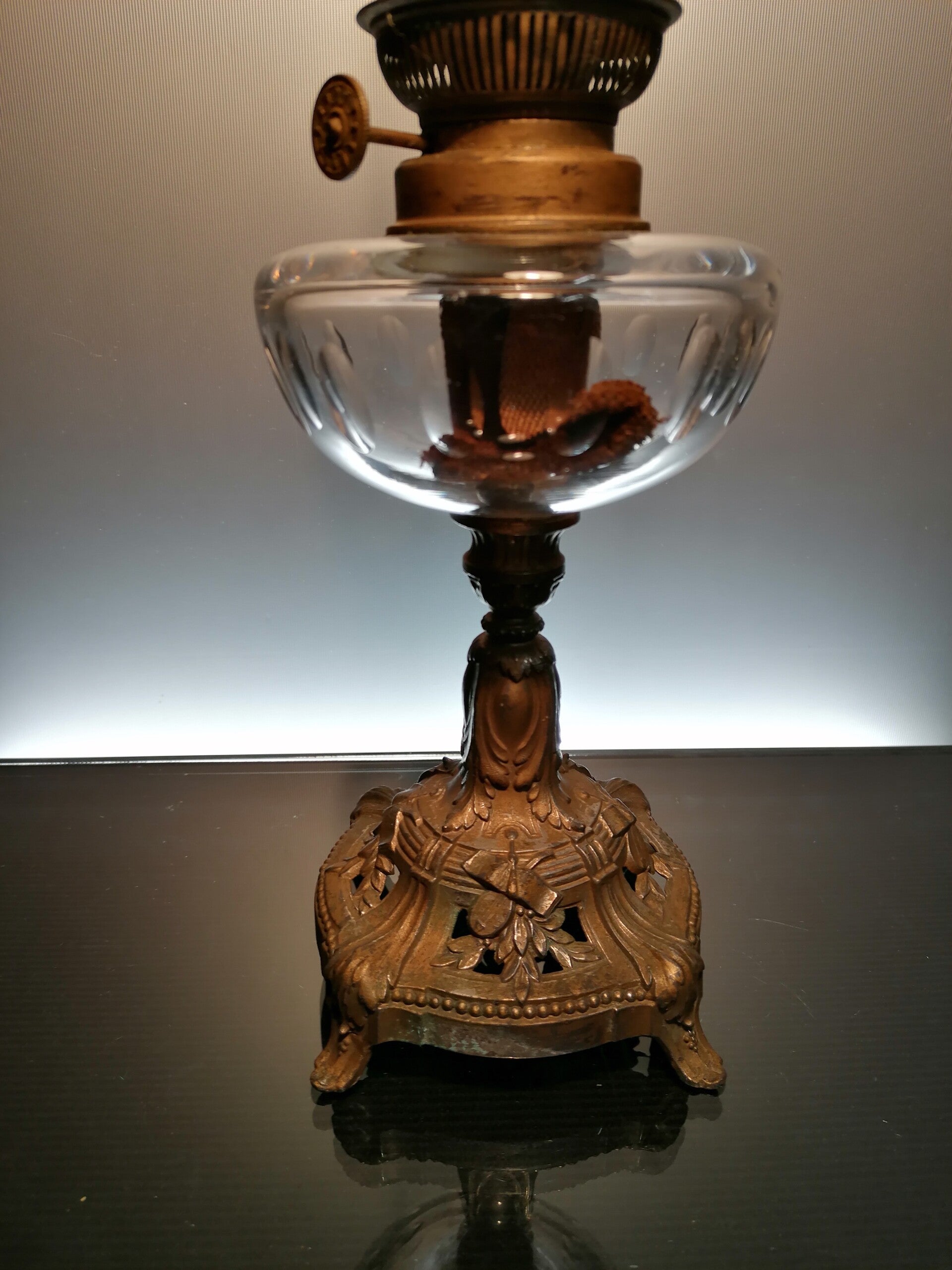 The fitting for the wick is made of copper, unfortunately it has a small crack.