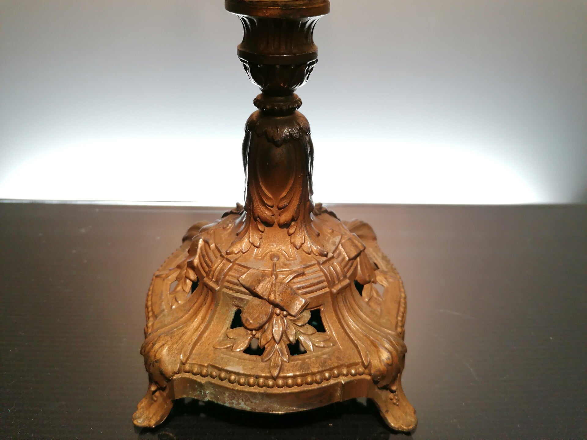 The base of the lamp is made of metal and has a gold gilding, which has acquired a lived patina over time.
