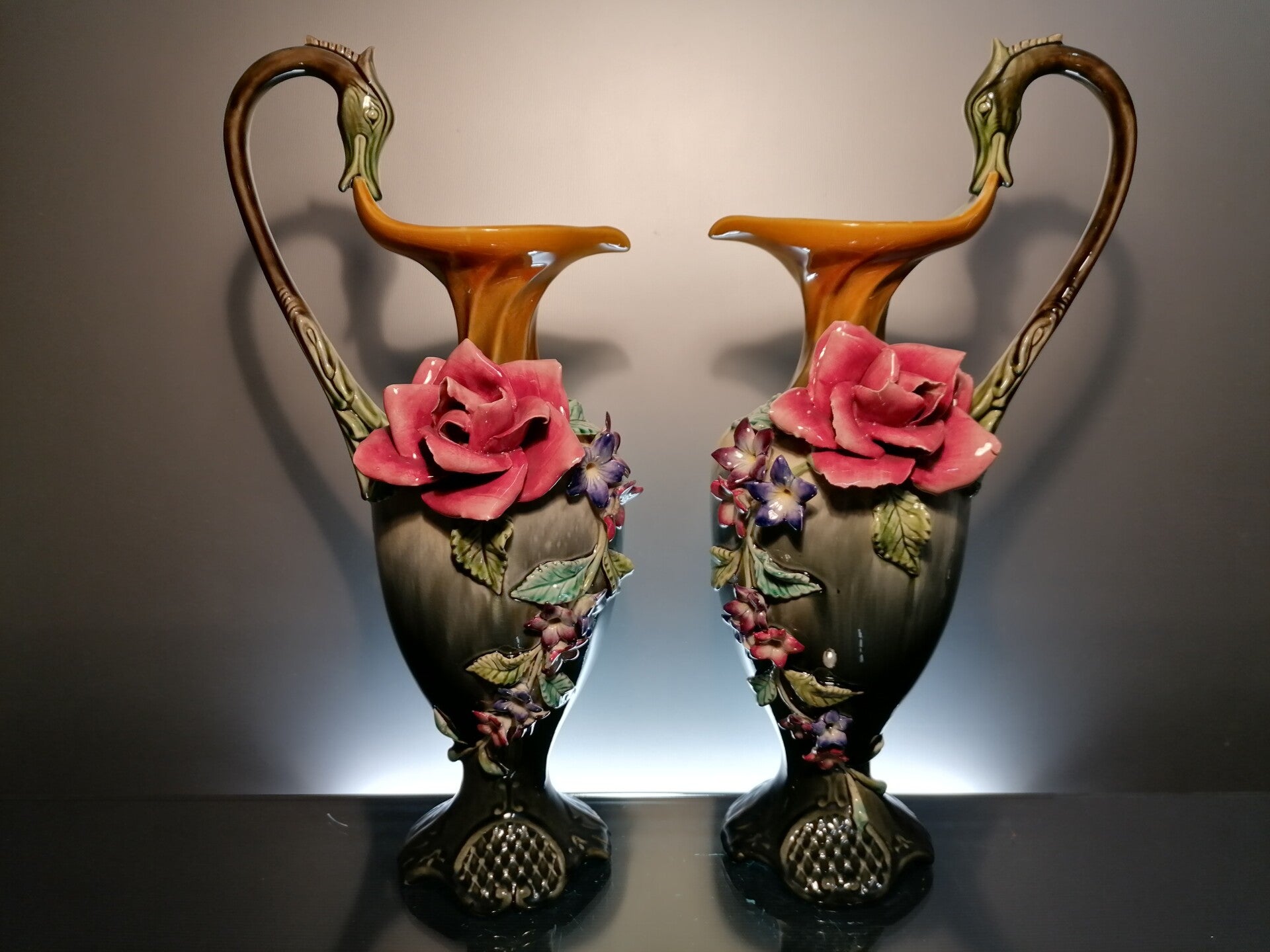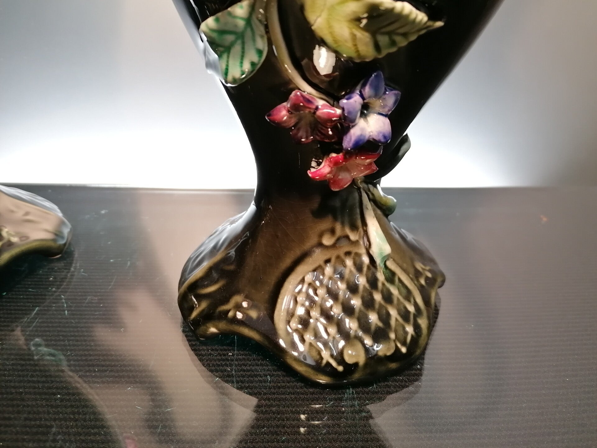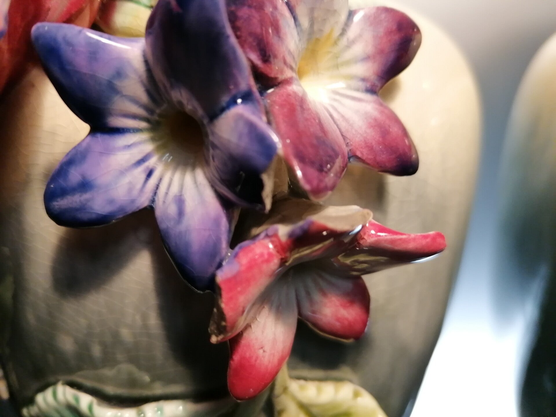 The vases are made in ceramic with a brown, blue and green glaze and finished with colored flowers and leaves in ceramic.