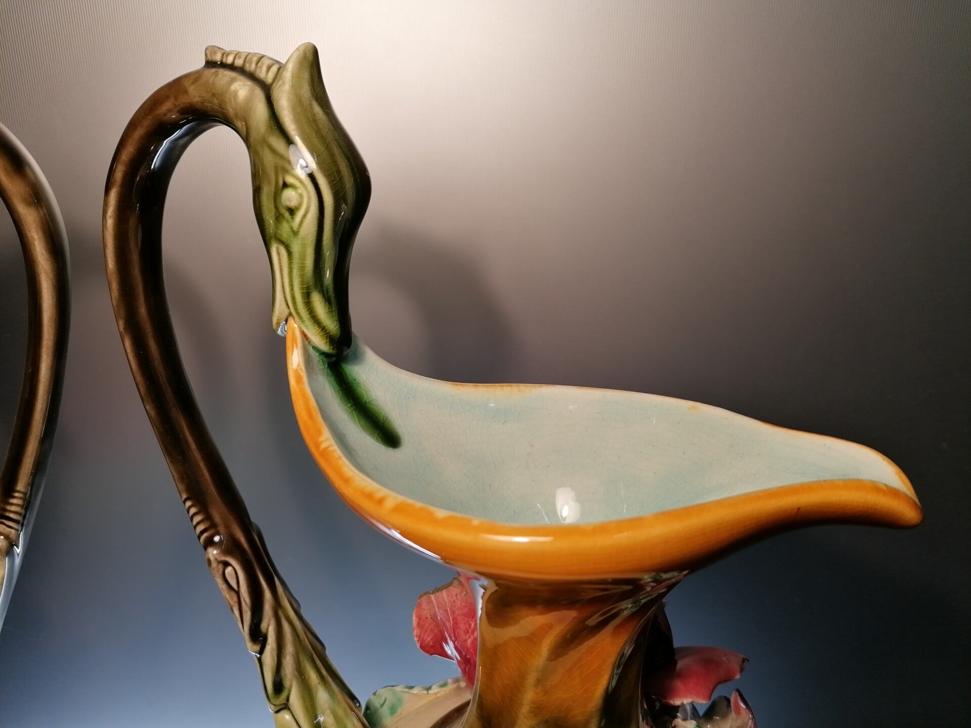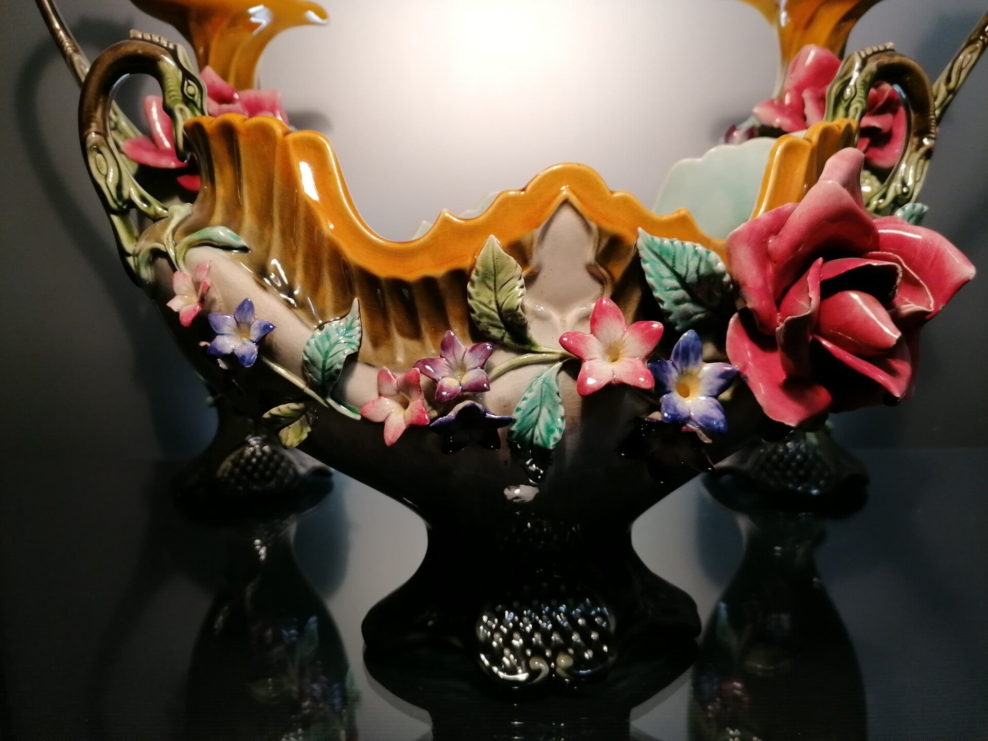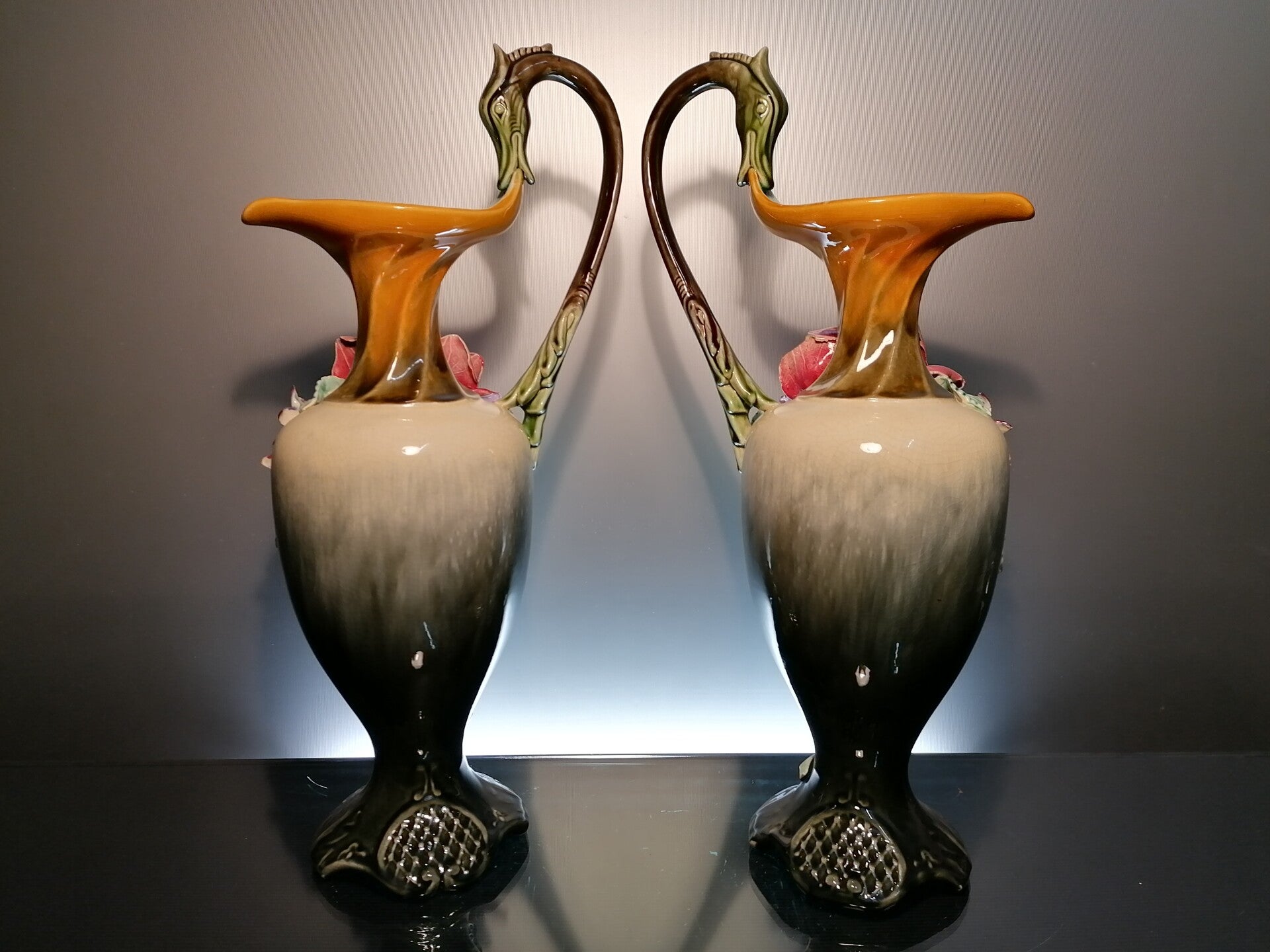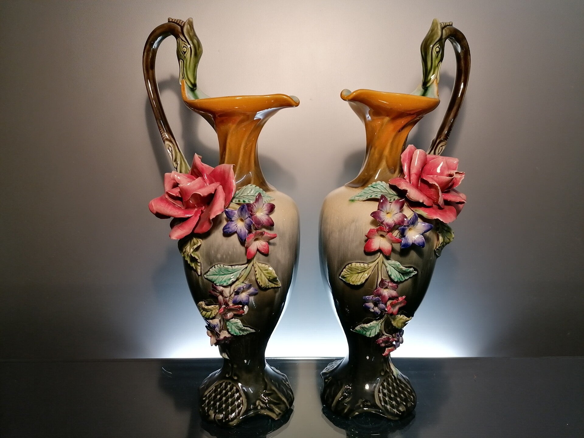The vases are made in ceramic with a brown, blue and green glaze and finished with colored flowers and leaves in ceramic.