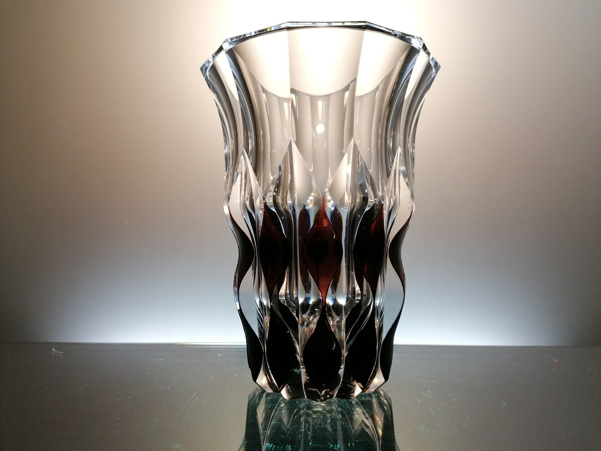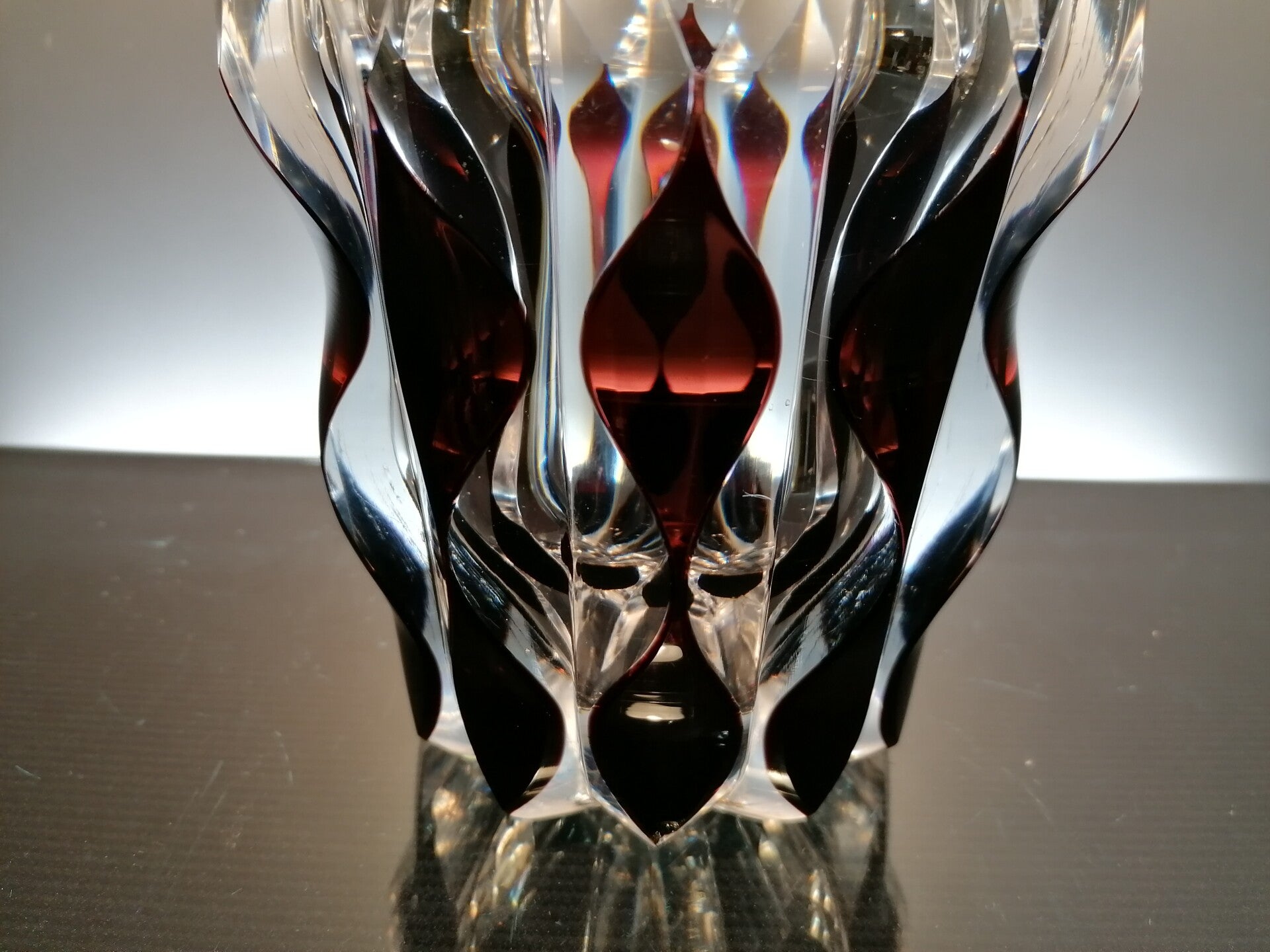 This rare vase is mouth blown from clear crystal, after which a layer of prume crystal is applied over it. During the finish, part of the prume crystal is then cut away so that beautiful geometric figures appear. These, in turn, give a beautiful sparkle in the light.