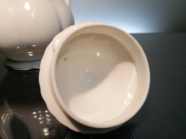 The coffee pot is made of fine "Bone China" porcelain. These are beautifully decorated with roses and gold paint.