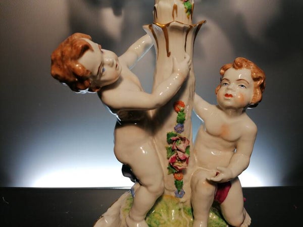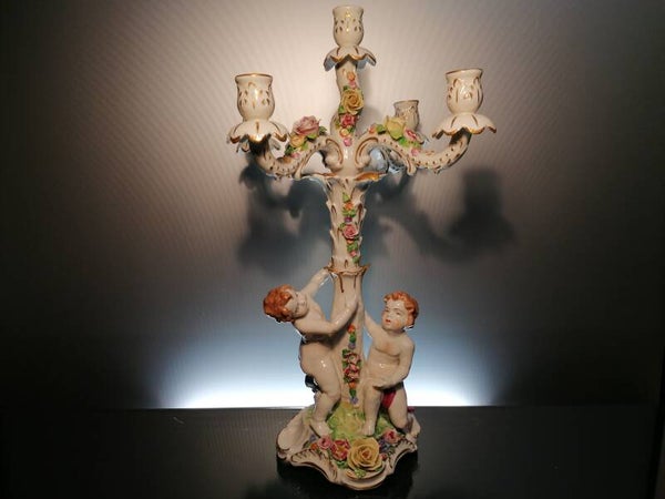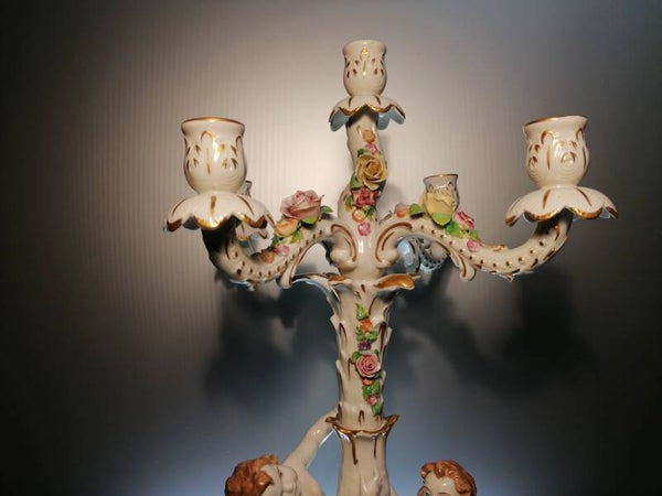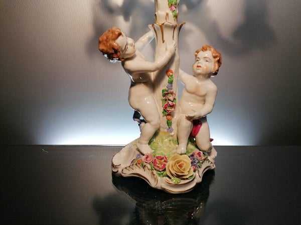 The candlestick is beautifully decorated with cherubs and flowers.
