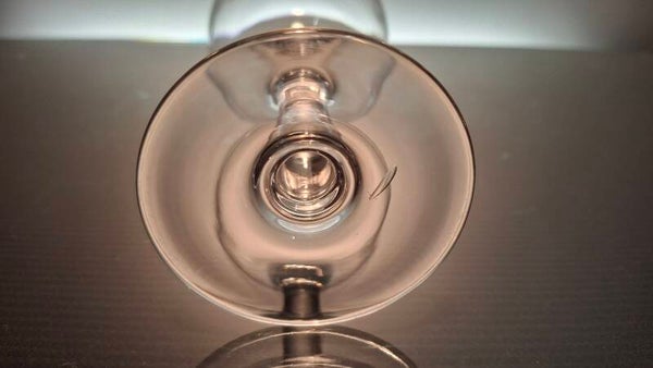 The glass chalice is mounted on a straight stem.