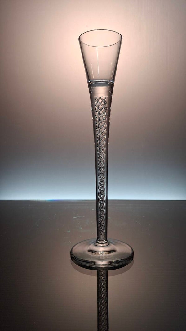 1 glass has a twist stem and the other glass has a straight stem with 2 twisted air bubbles inside that cross each other.