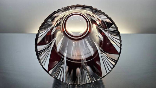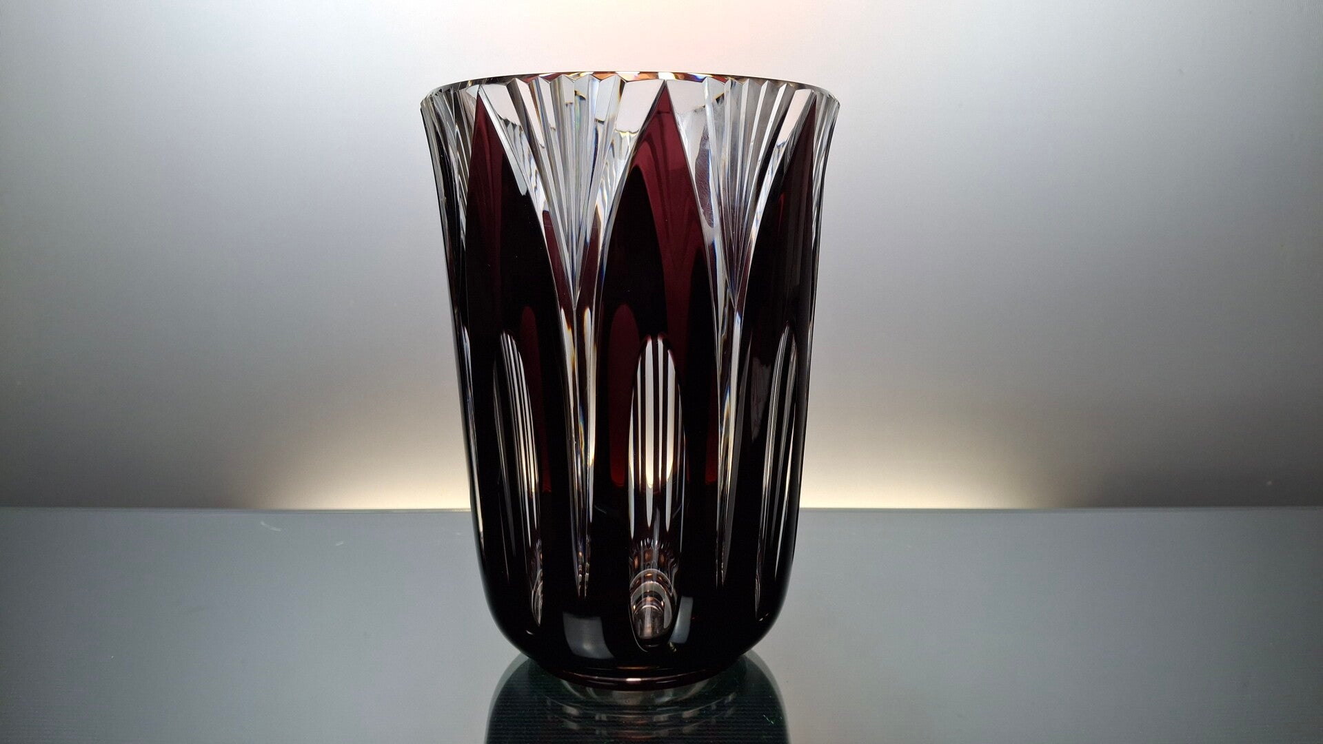 This rare vase is mouth blown from clear crystal, after which a layer of prume crystal is applied over it. During the finish, part of the prume crystal is then cut away so that beautiful geometric figures appear. These, in turn, give a beautiful sparkle in the light.