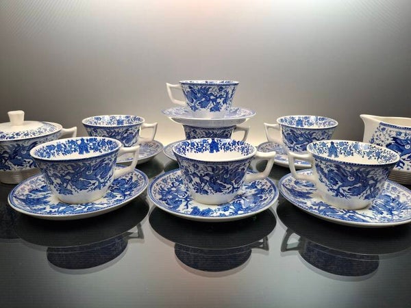 The coffee / tea set is beautifully decorated with blue dragons and other Chinese accents.