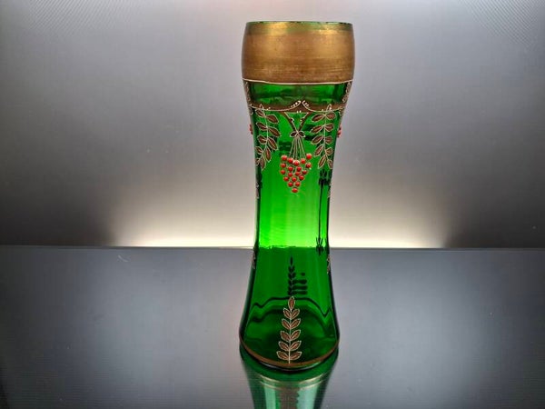 Afterblowing the vase, she is beautifully decorated with enamel painted grapes and gold painted decorations.