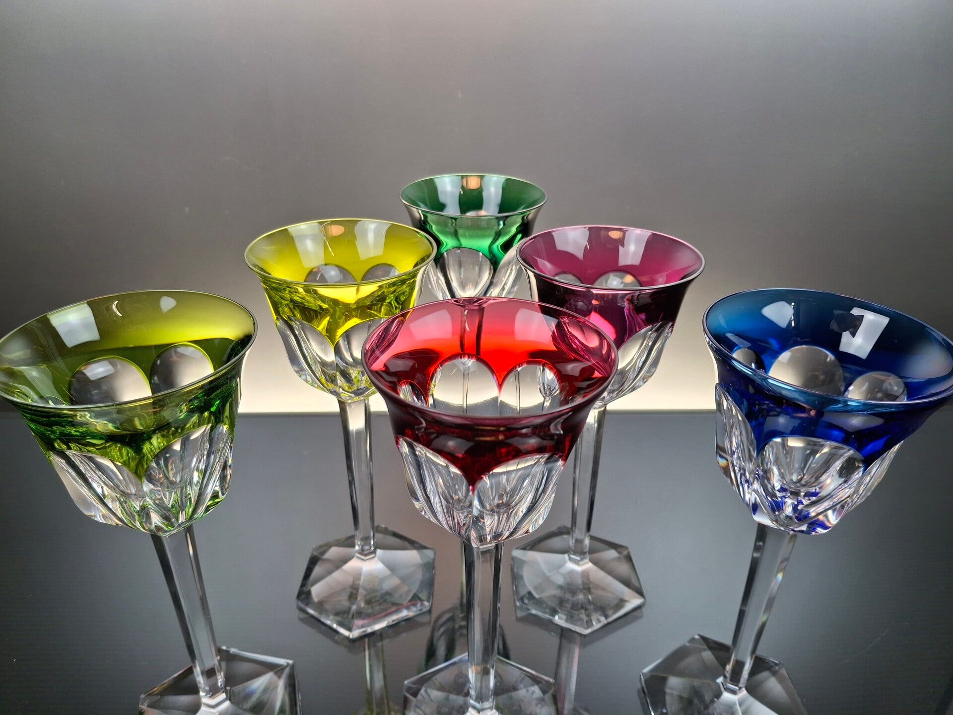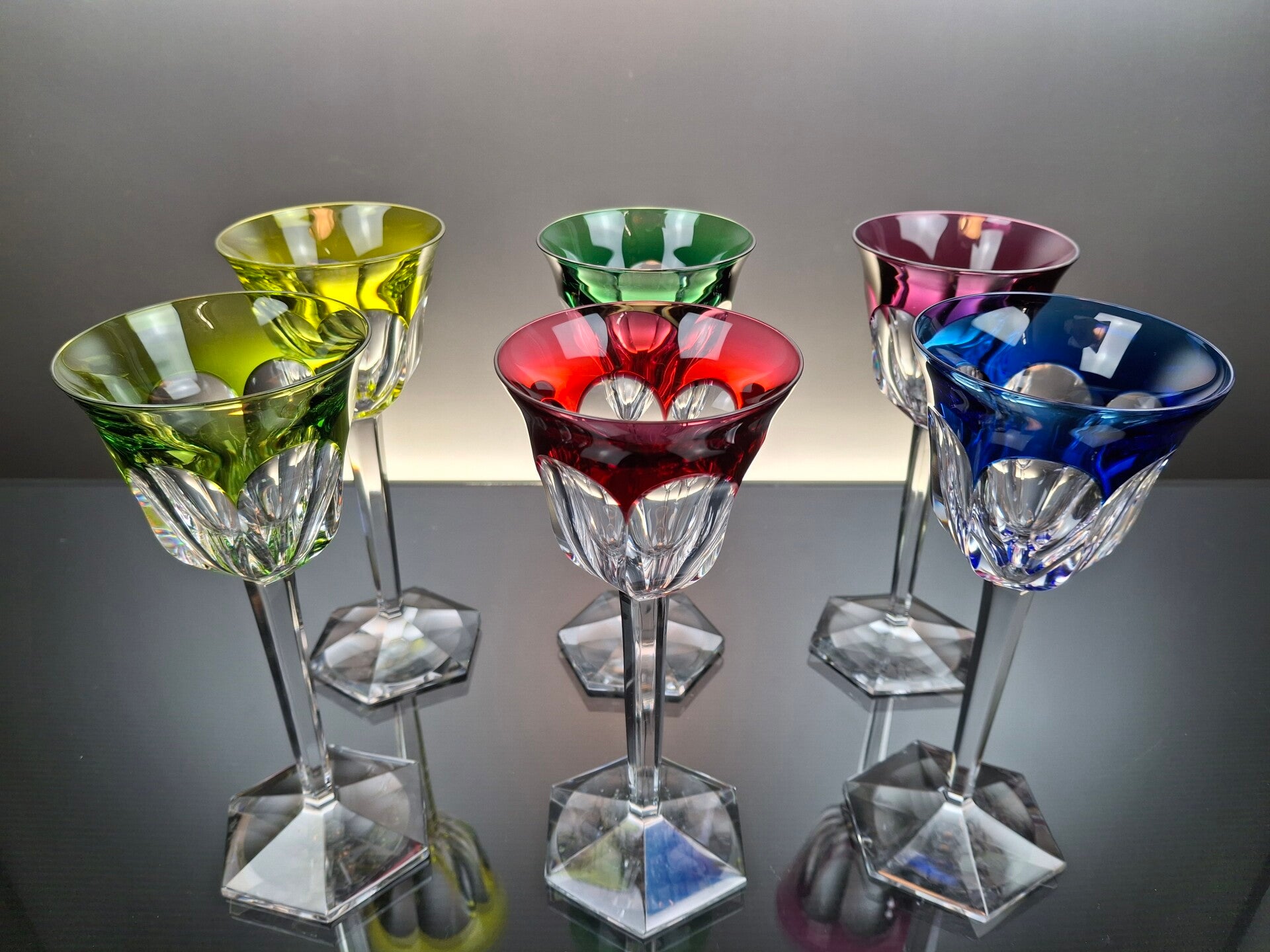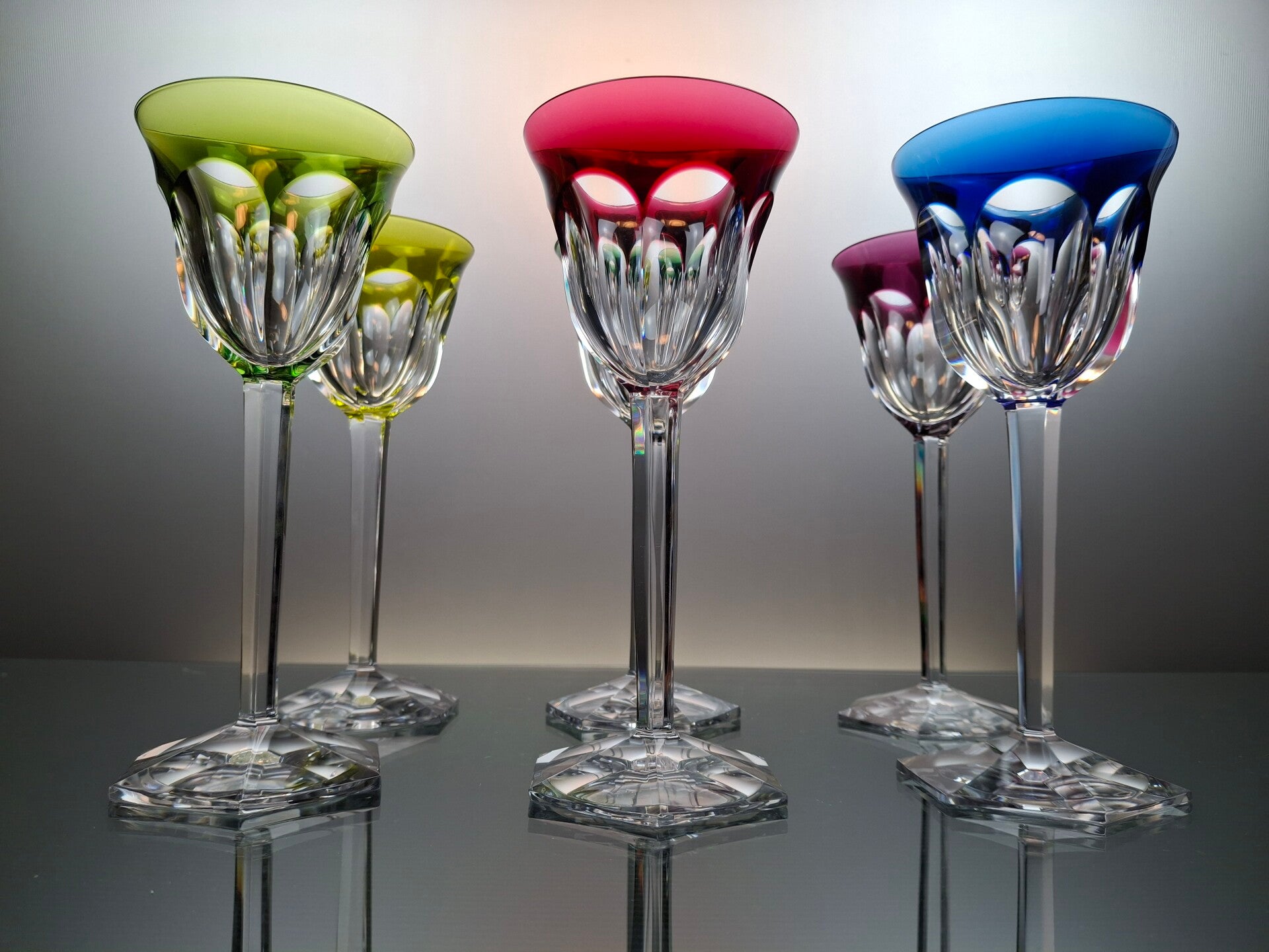 This glasses are made of mouth blown clear crystal, after which a layer of colored crystal is applied over it. During the finish, part of the colored crystal is then cut away so that beautiful geometric figures appear. These, in turn, give a beautiful sparkle in the light.