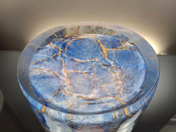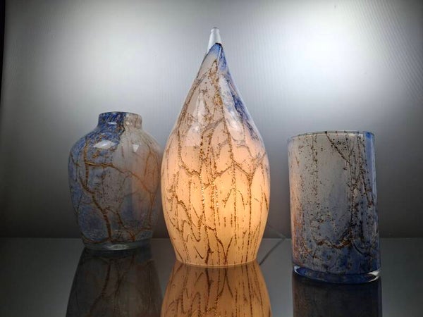 All objects are made of mouth-blown glass with marble effects of blue, white and gold.