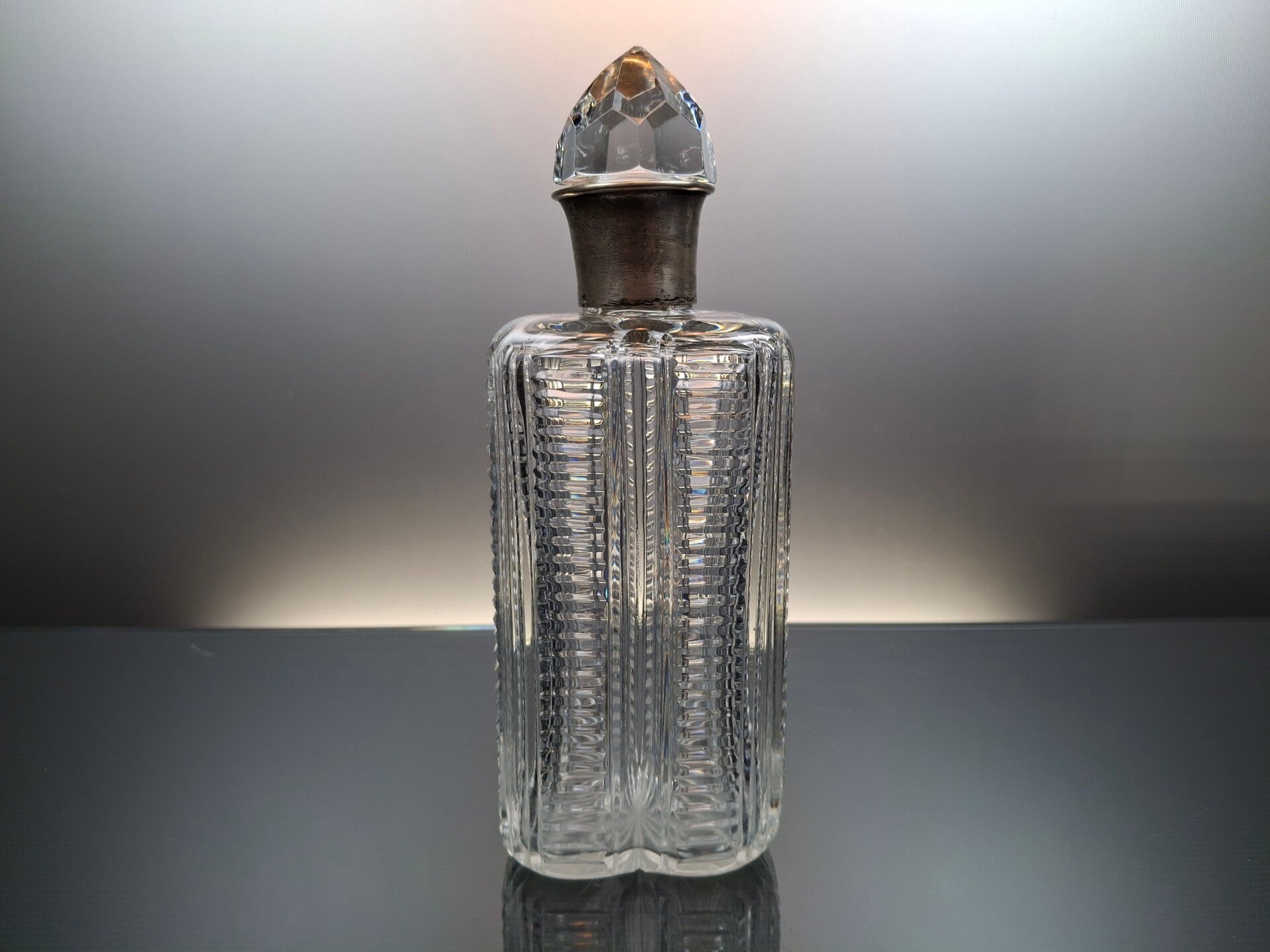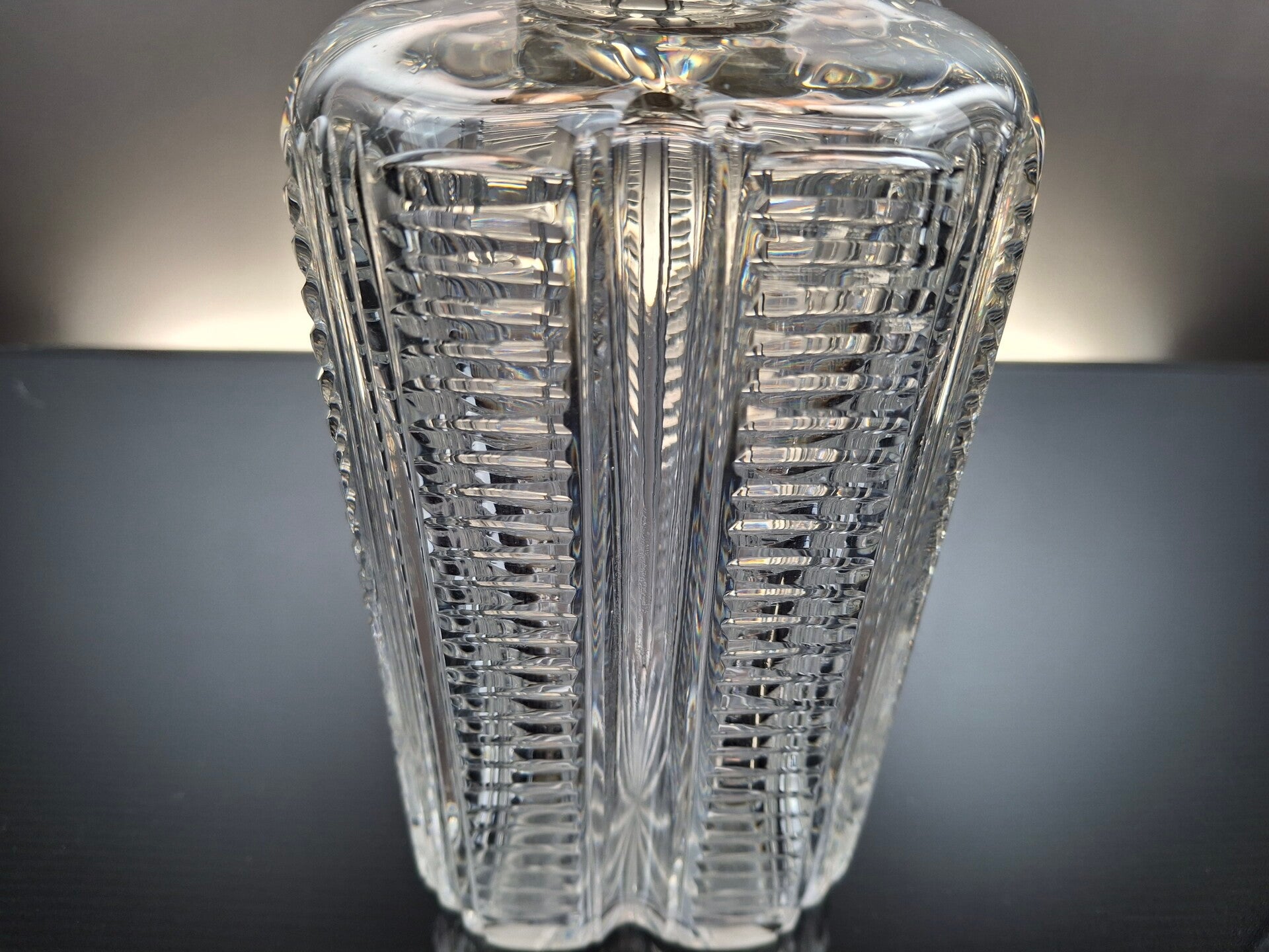 The carafe has a typical art deco design due to its square model with rounded corners and horizontally cut lines.
