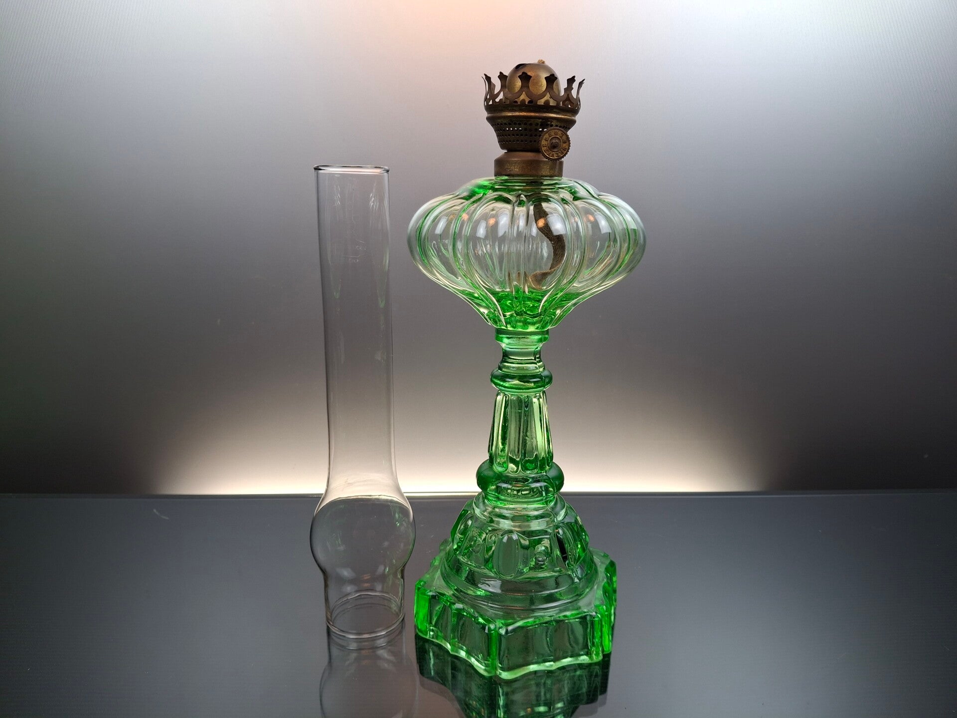 Rare 19th Century green uranium glass Oil Lamp “L&B”