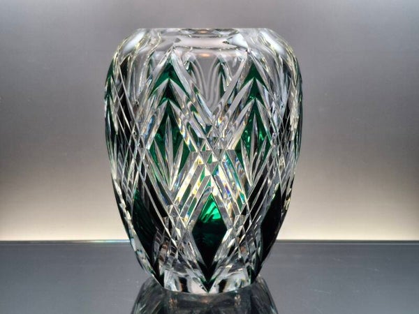 This rare vase is mouth blown from clear crystal, after which a layer of green crystal is applied over it. During the finish, part of the green crystal is then cut away so that beautiful geometric figures appear. These, in turn, give a beautiful sparkle in the light.