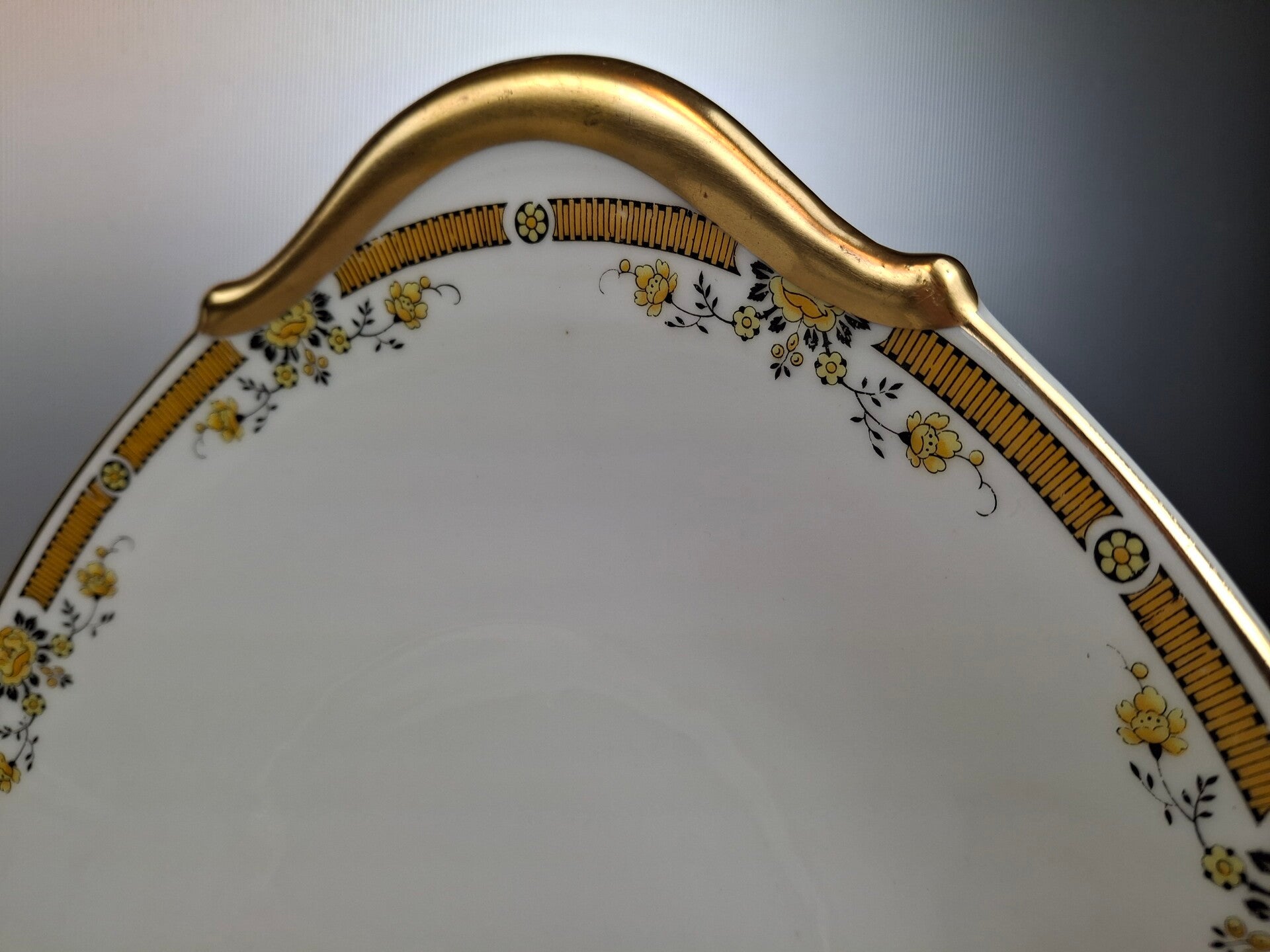 The dinner set is made of fine porcelain and decorated with fine yellow flower and gold garlands.
