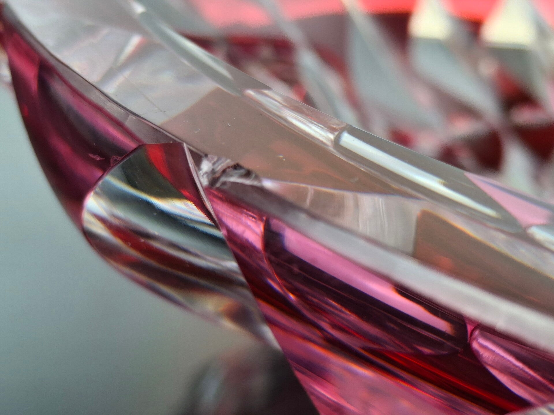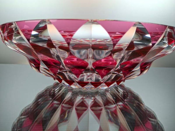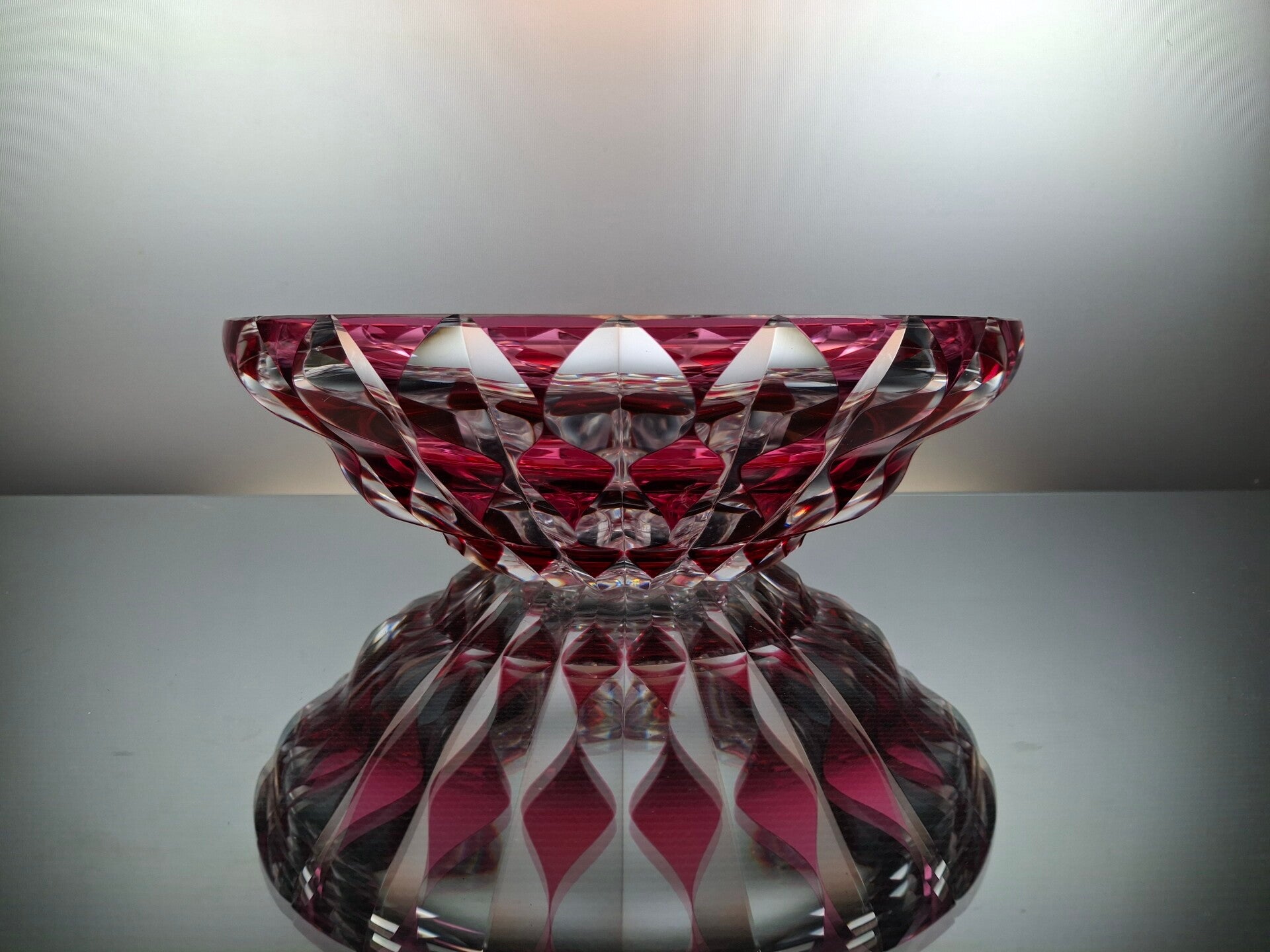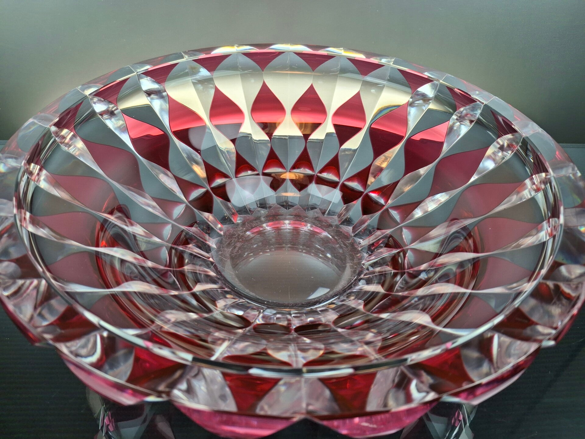 This rare bowl is mouth blown from clear crystal, after which a layer of red crystal is applied over it. During the finish, part of the red crystal is then cut away so that beautiful geometric figures appear. These, in turn, give a beautiful sparkle in the light.