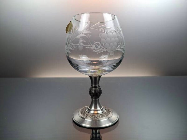 The glasses are made of mouth-blown German Crystal. After blowing the crystal, the glasses were very finely decorated with engraved grape vines.