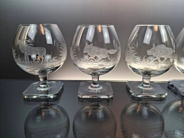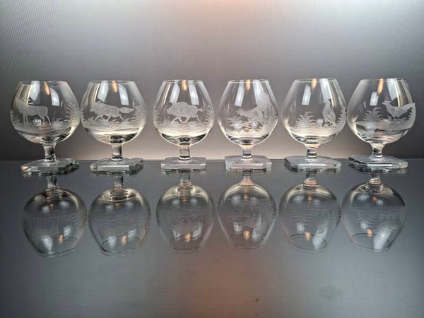 6 rare crystal Cognac glasses Val Saint Lambert « Hunting - Rouillac»