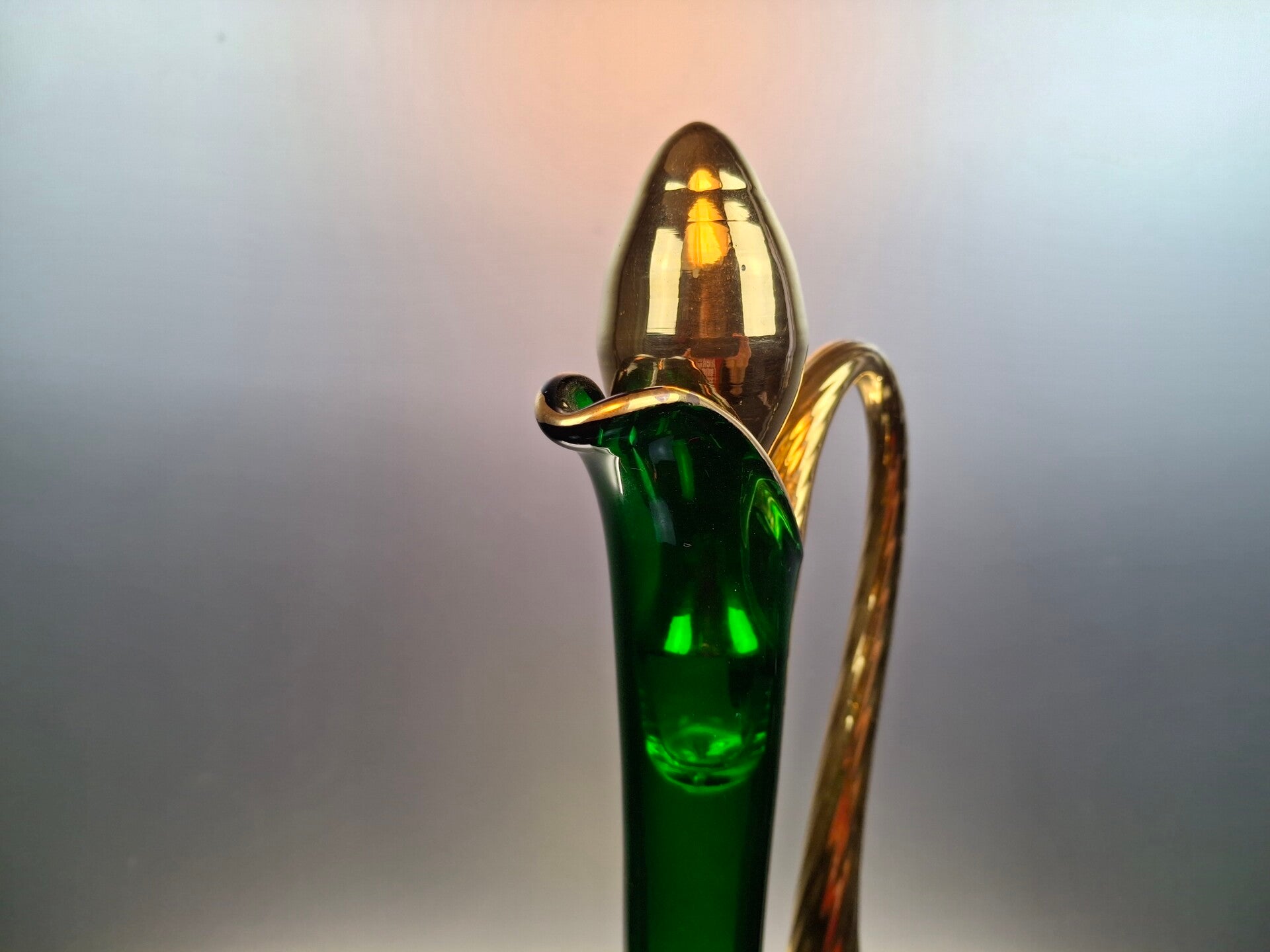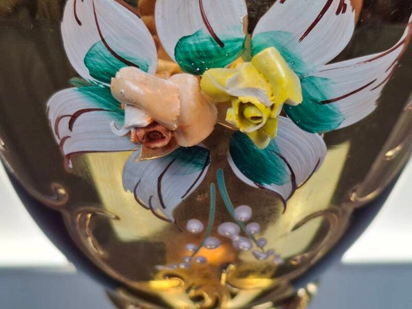 After blowing the objects, they were beautifully decorated with applied enamel flowers and 24kt gold painting.