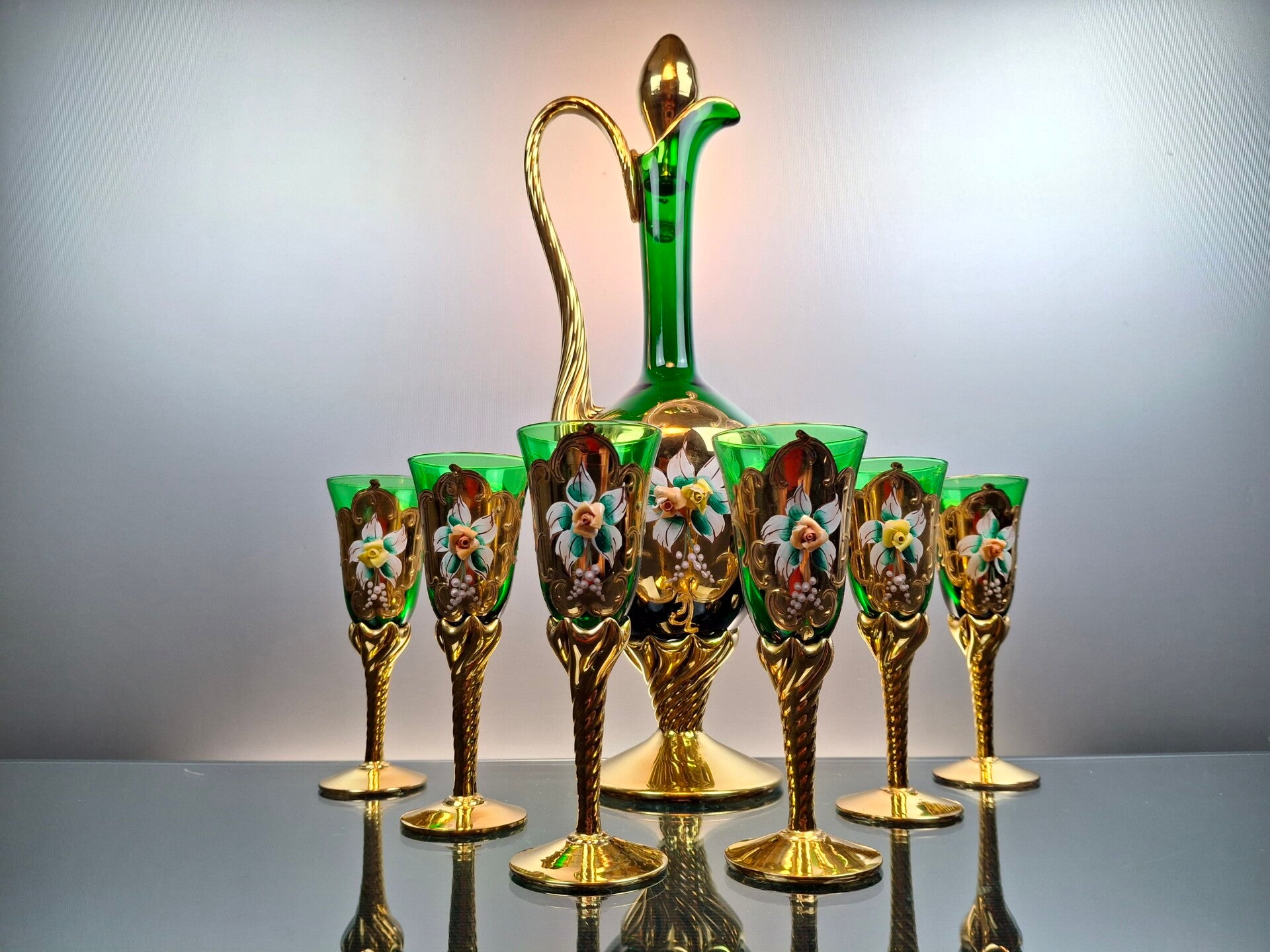 The glasses and carafe are mounted on a twisted stem, which is very typical of Italian glassware.