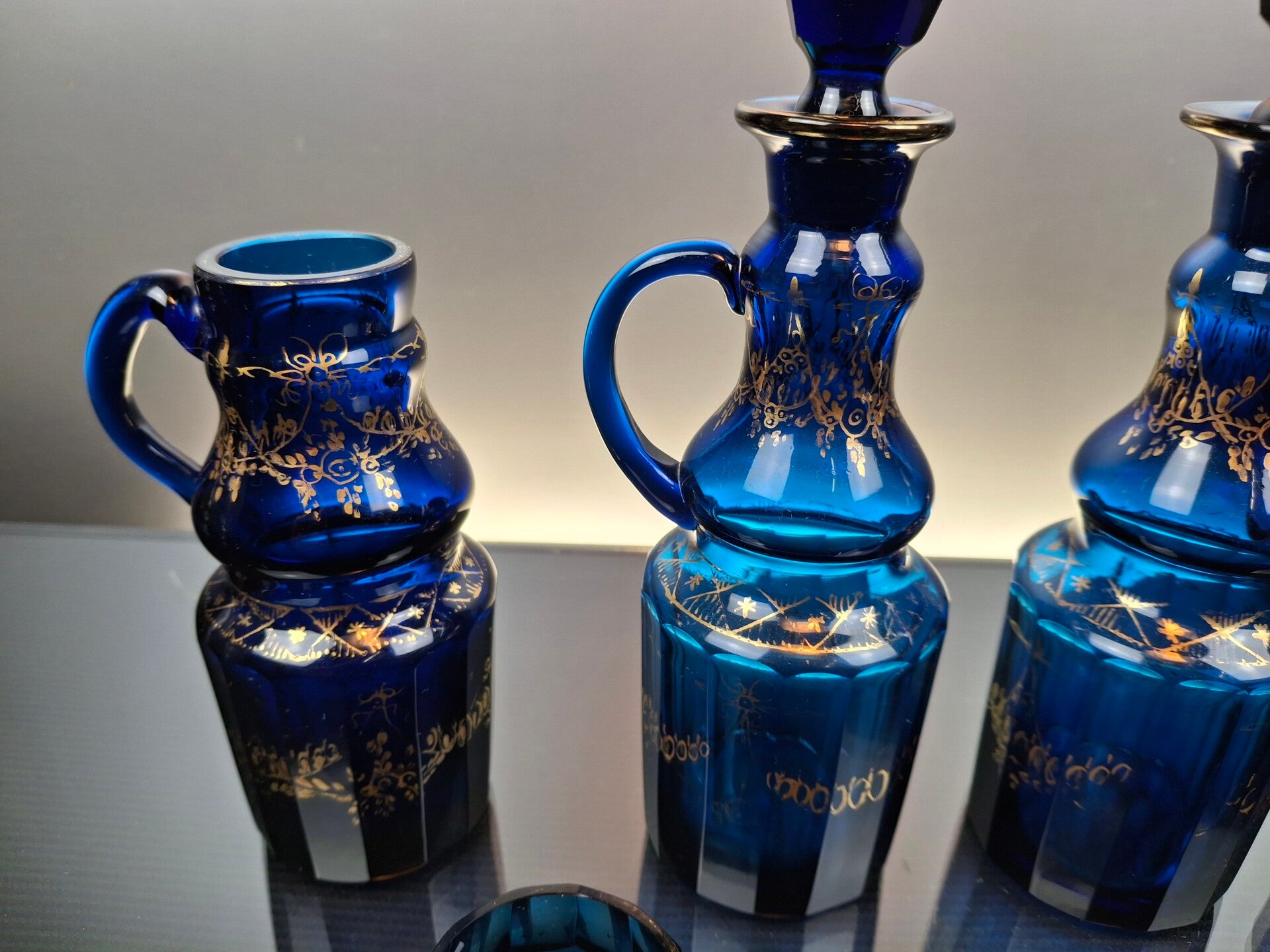 The deep blue glass objects were blown mouth and then painted very finely with gold paint.