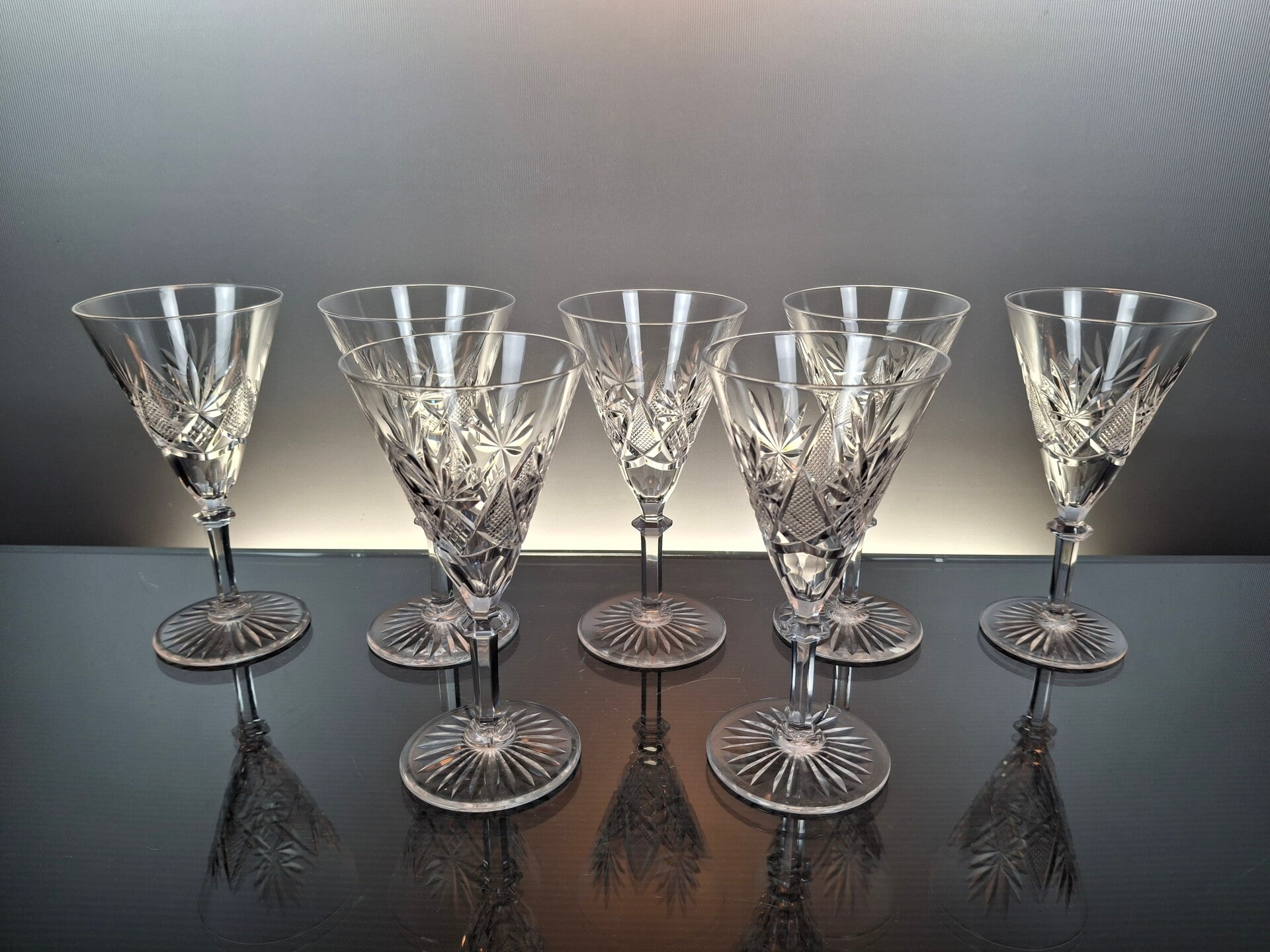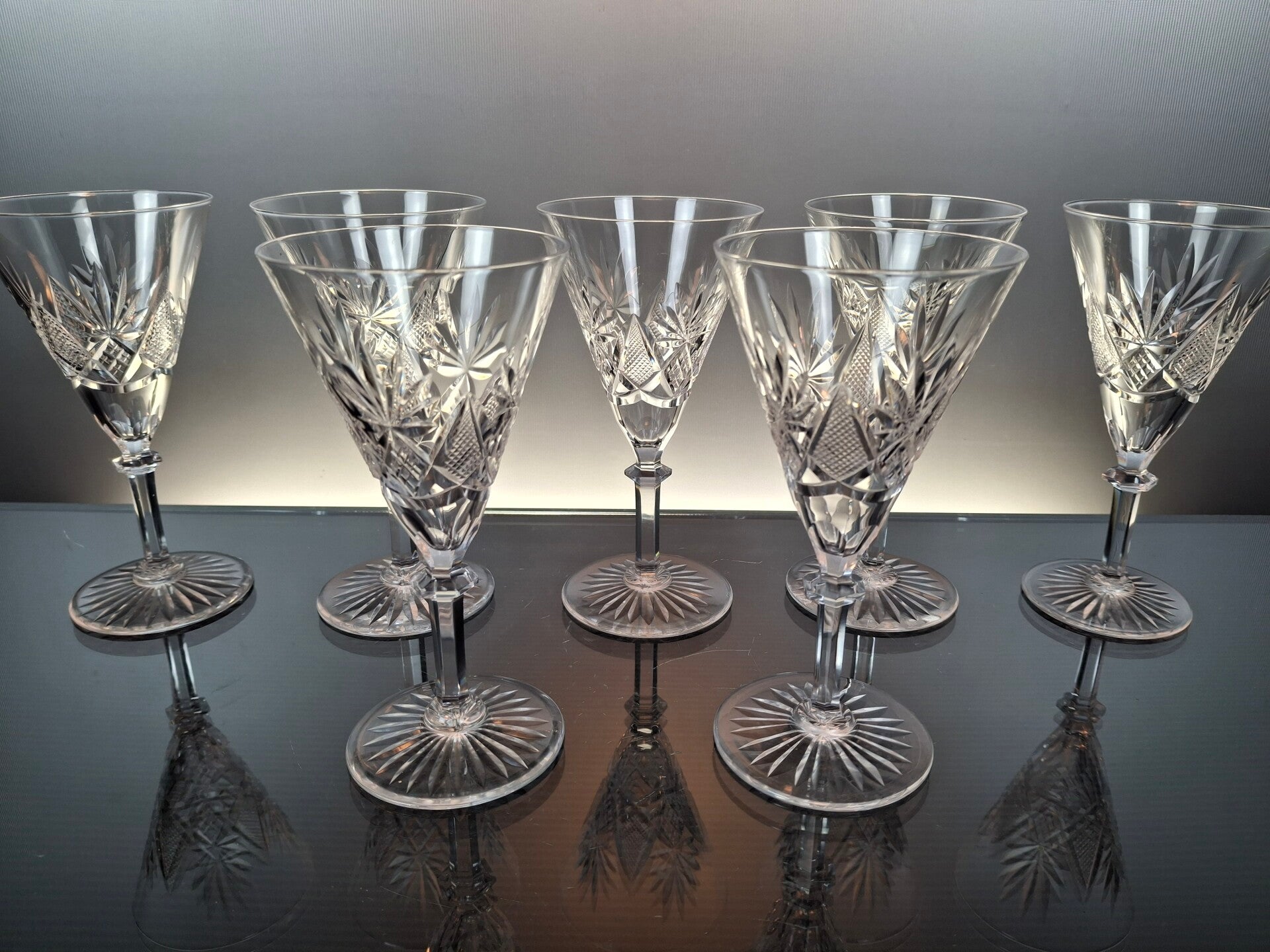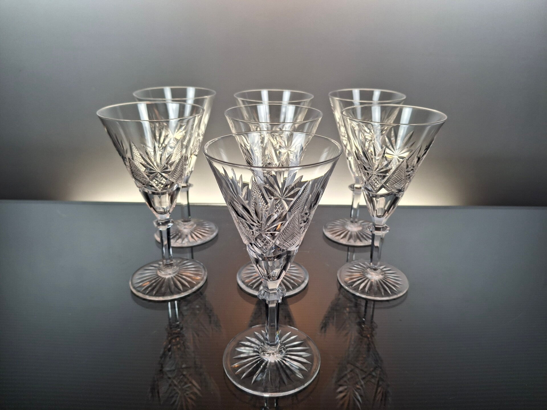 7 rare wine glasses, made in the first part of the 20th century in Belgium, by the famous crystal house “Val Saint Lambert”