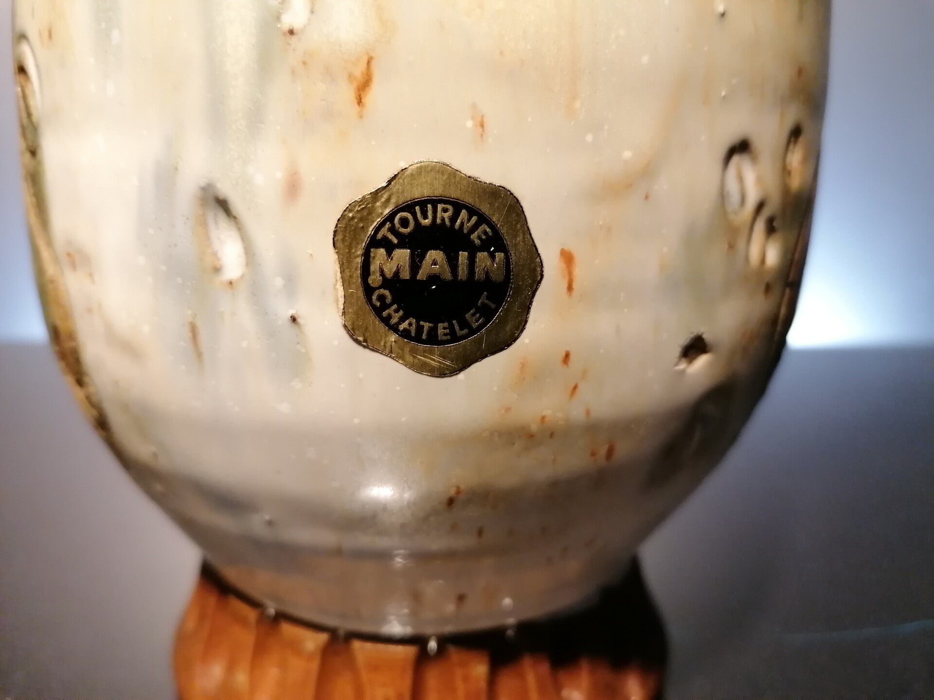The jug is made of earthenware and decorated with the typical grey drip glaze.