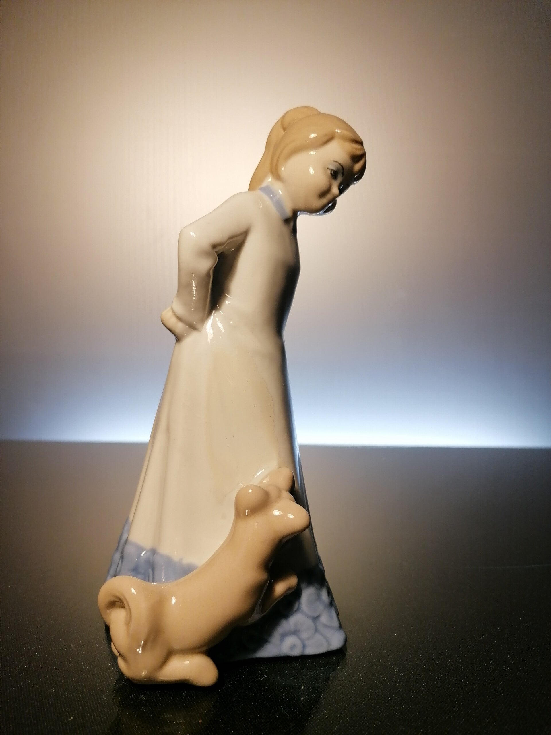This little girl with her dog is made of porcelain with a white and blue glaze.