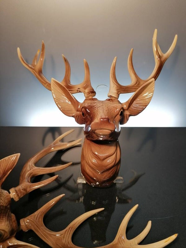 The deer heads are made in ceramic and finished with a brown glaze.