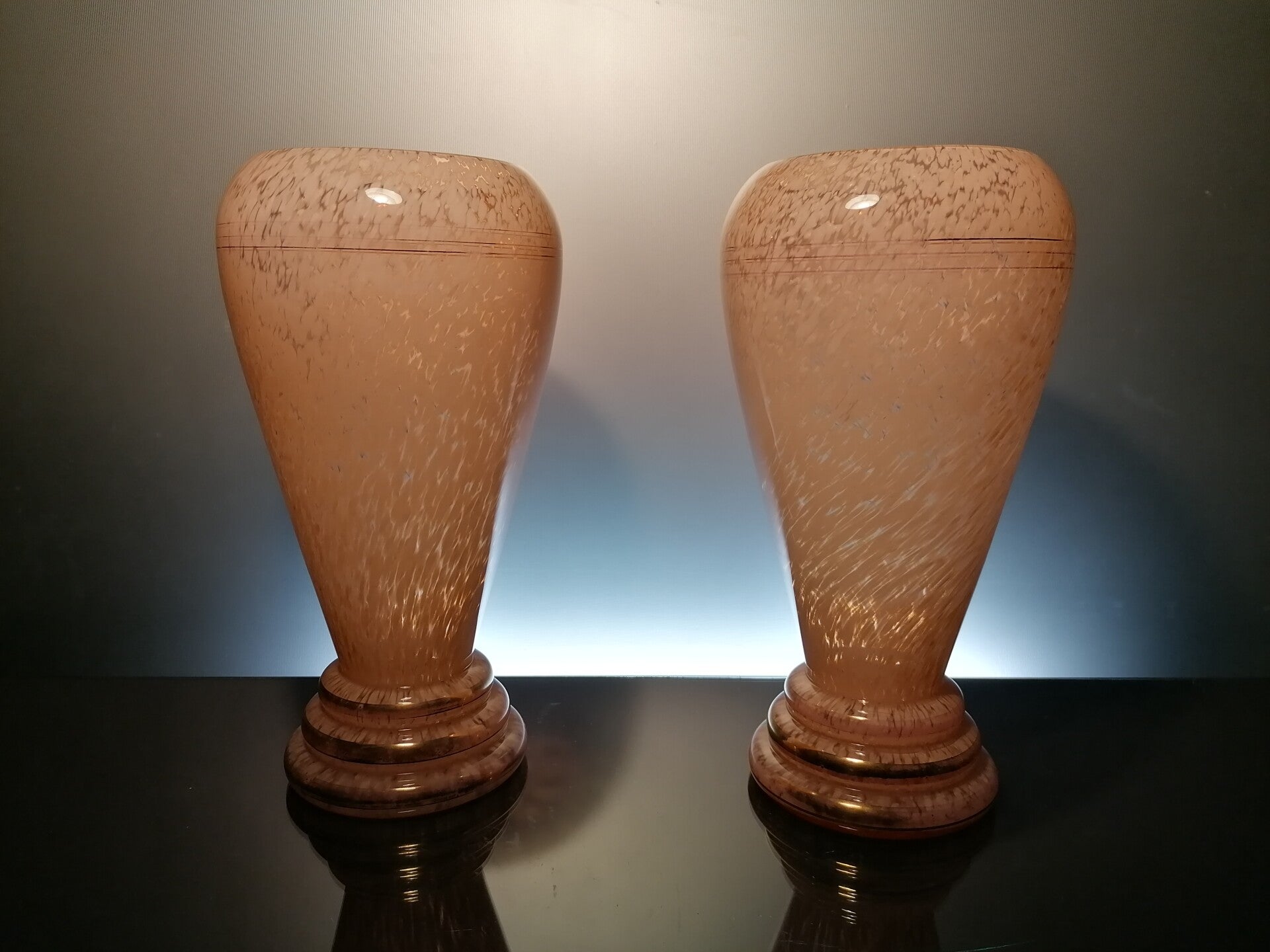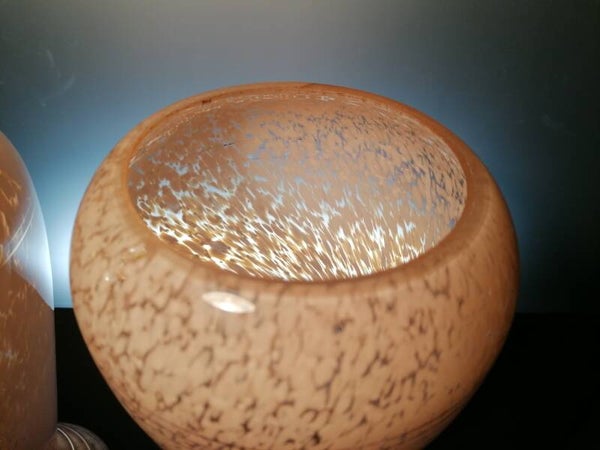 Very beautiful glass vases in mouth-blown glass, with a crystal content to obtain a beautiful shine. These vases are made from different types of small glass beads, with pink as the main colour. These glass beads were fused with each other, giving you a unique speckle pattern.