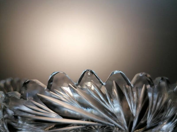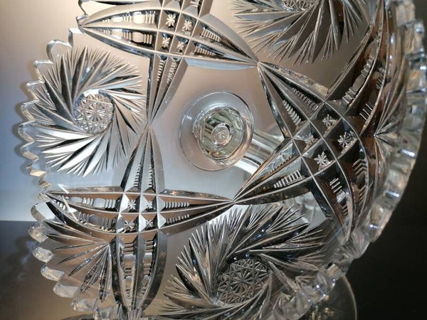 This rare fruit bowl is mouth blown from clear crystal. During the finish, part of the crystal is then cut away so that beautiful geometric figures appear. These, in turn, give a beautiful sparkle in the light.