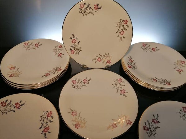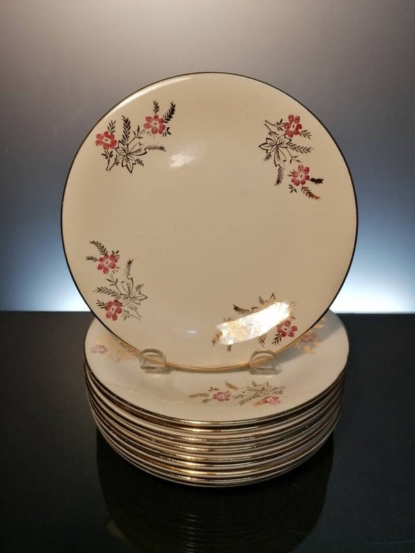10 beautiful dessert plates decorated with pink roses and golden leafs.