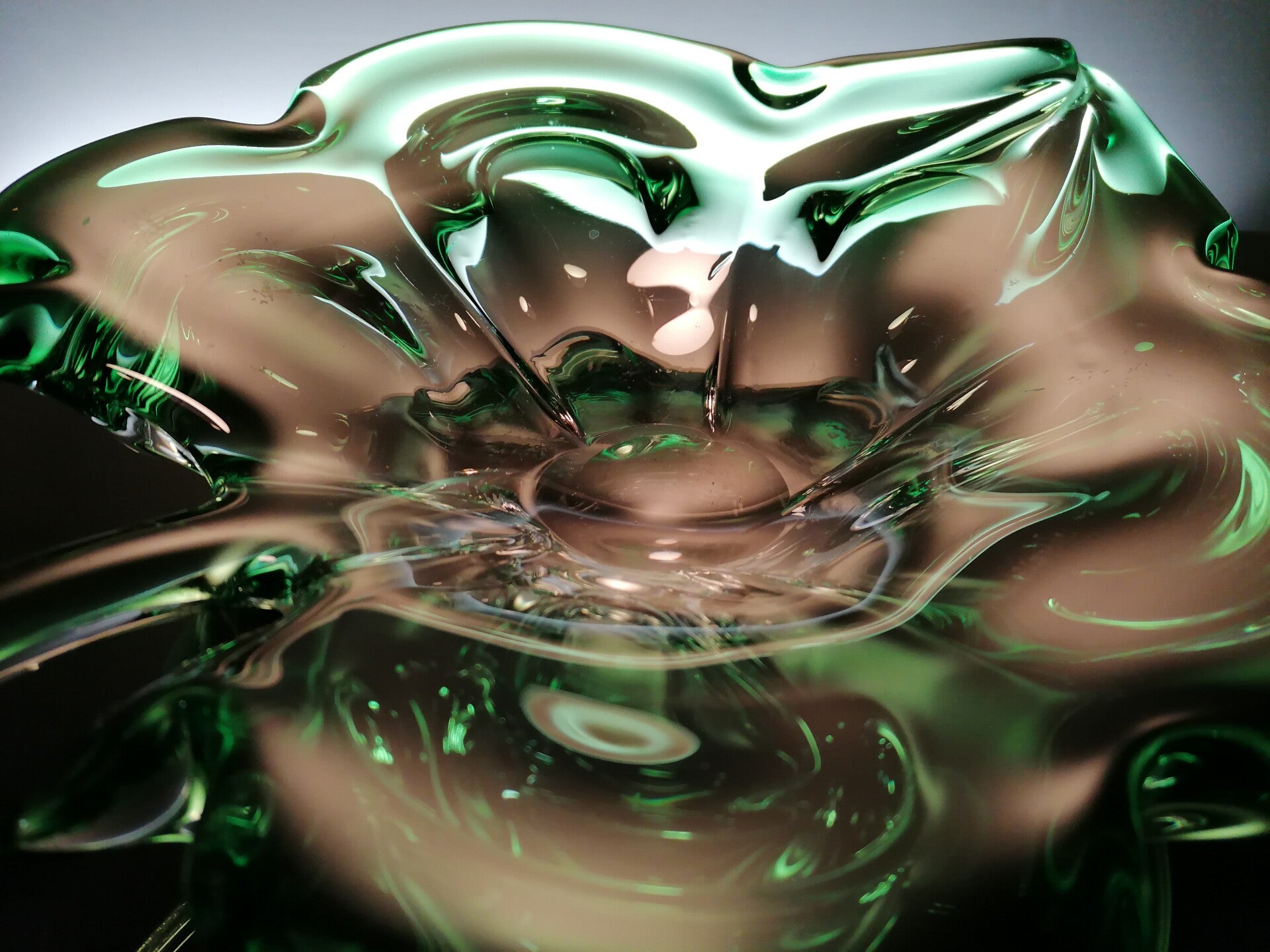 Very nice bowl or table piece, made in clear and green crystal, with a nice shape of a leaf.